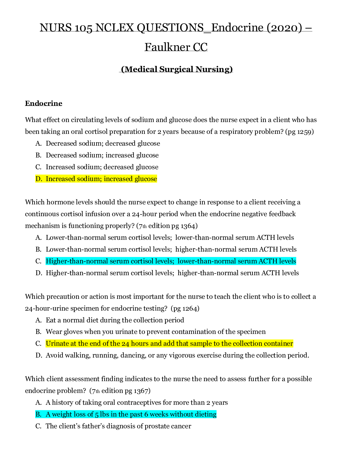 Medical Studies > EXAM > NURS 105 NCLEX QUESTIONS_Endocrine (2020) – Faulkner CC | NURS105 NCLEX QUESTIONS_Endocrine (2020) (All)