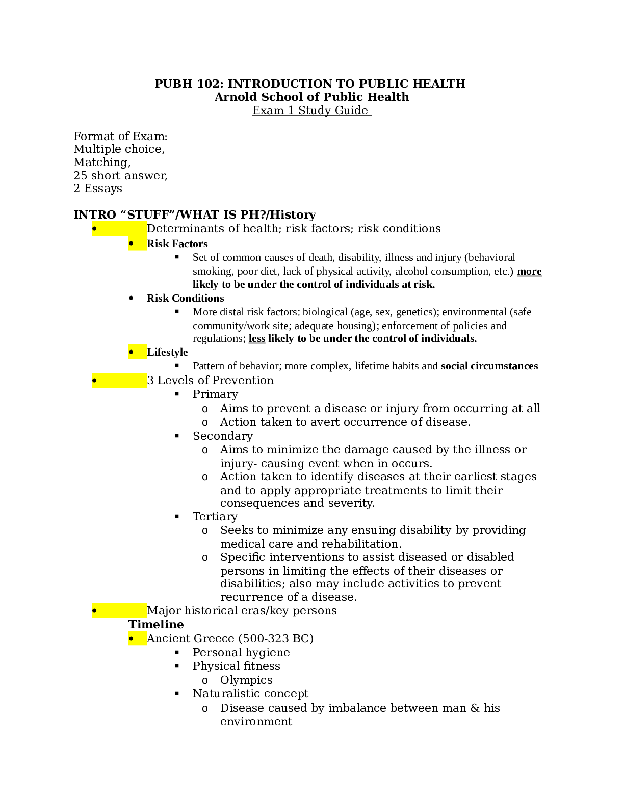Medical Studies > Summary > PUBH 102: INTRODUCTION TO PUBLIC HEALTH Arnold School of Public Health (All)