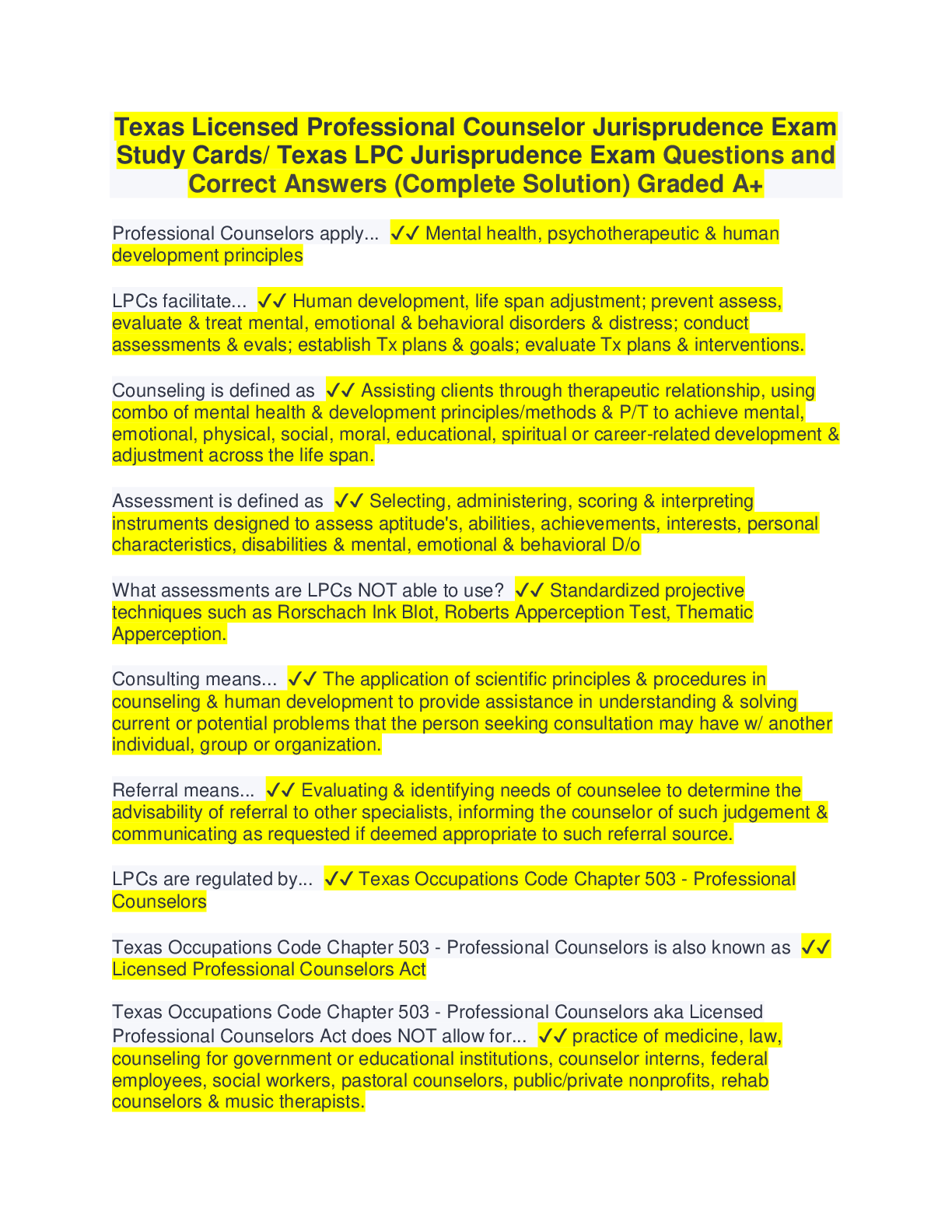 Medical Studies > QUESTIONS & ANSWERS > Texas Licensed Professional Counselor Jurisprudence Exam Study Cards/ Texas LPC Jurisprudence Exam Questions and Correct Answers (Complete Solution) Graded A+ (All)