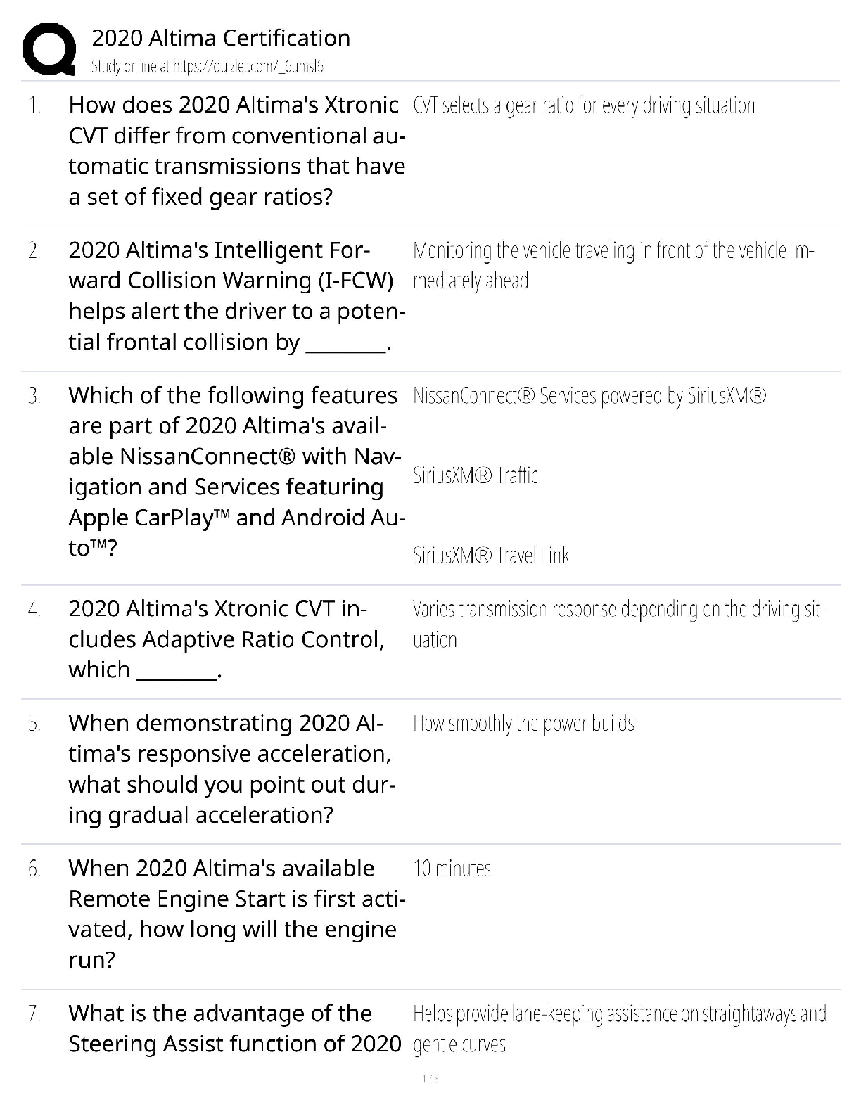 Business Administration > QUESTIONS & ANSWERS > 2020 Nissan Altima Certification / ProMaster 100% Score / 2025 Updated Guide (All)