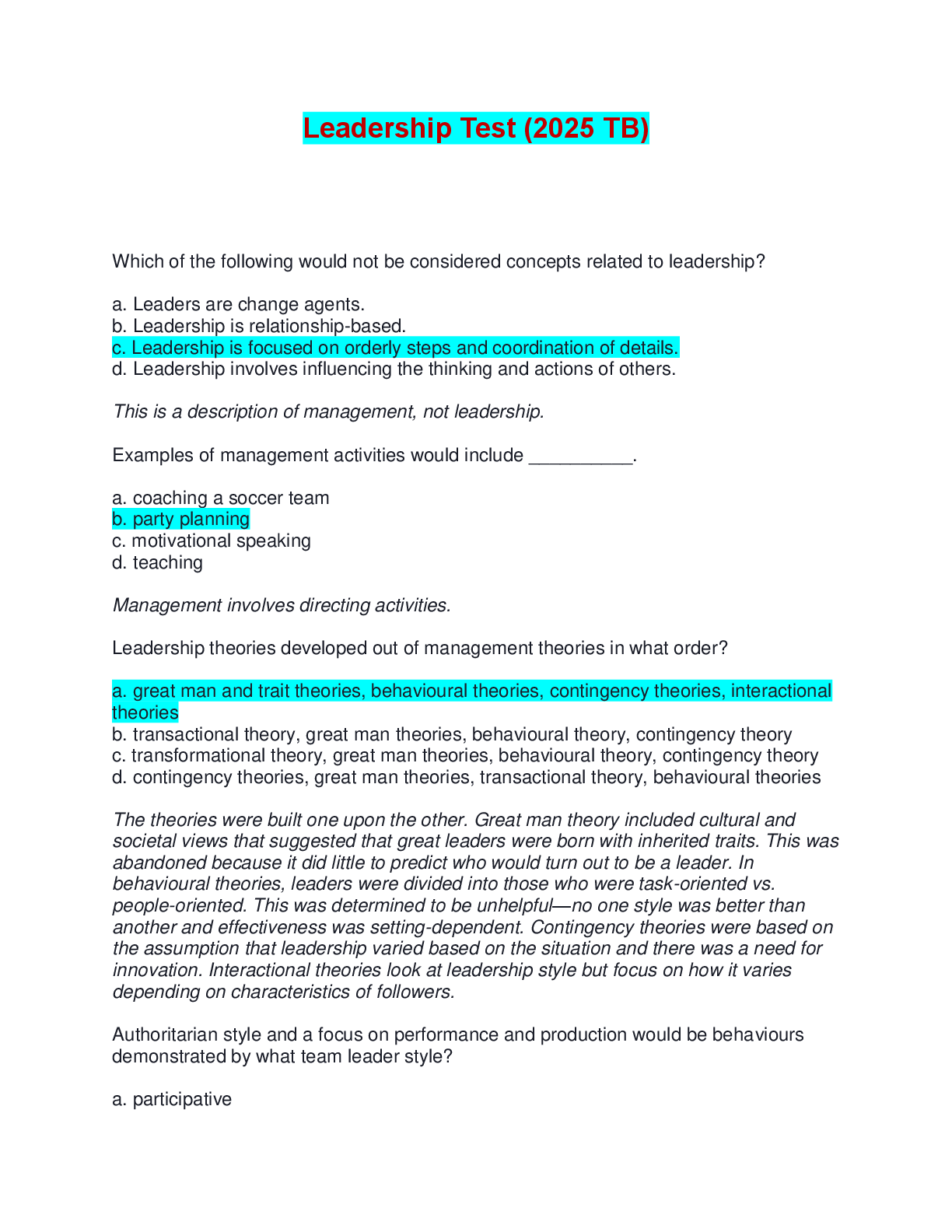 Leadership > EXAM > Leadership Test (2025 TB) | Complete Solutions (Verified Answers) (All)