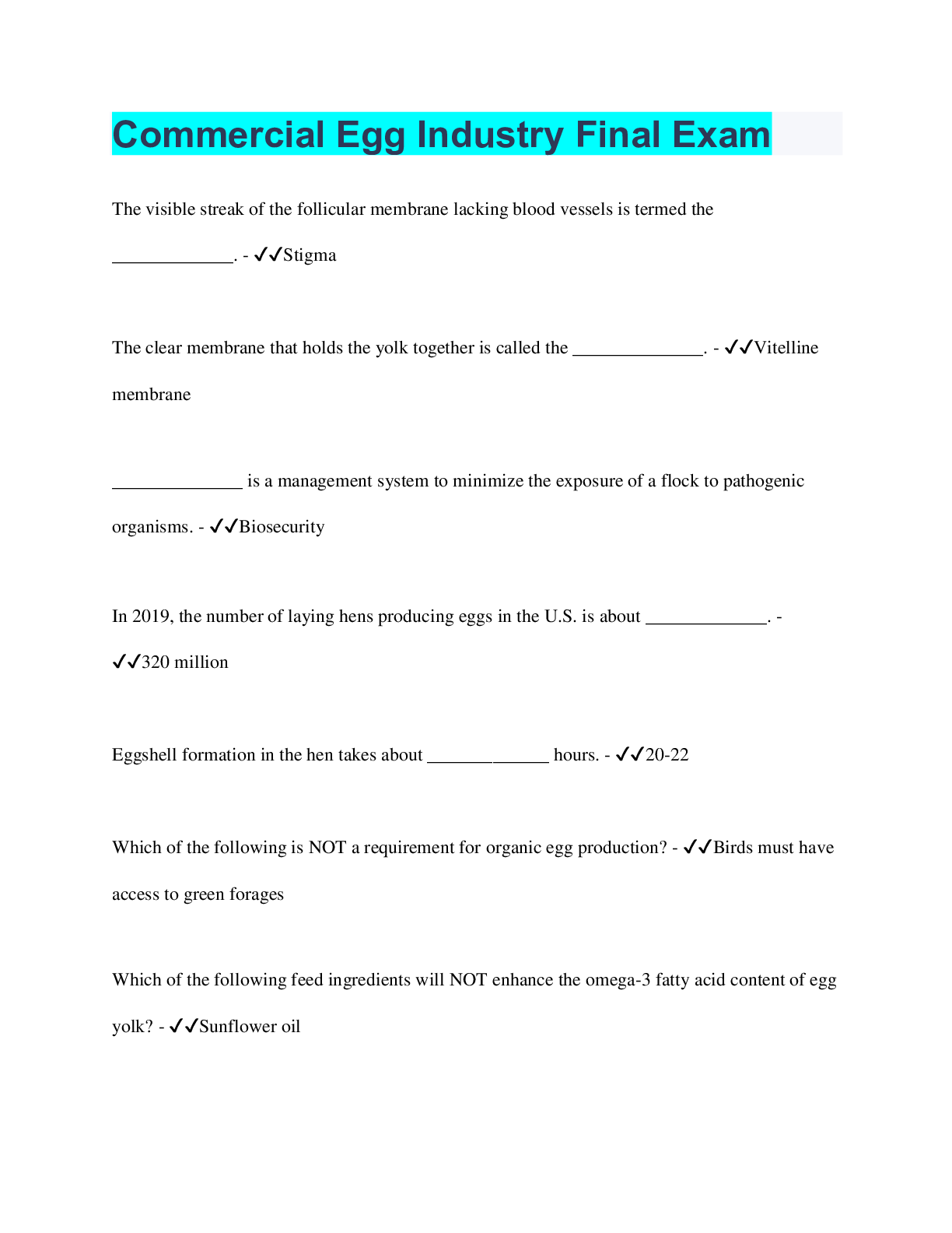 Agricultural Studies > QUESTIONS & ANSWERS > Commercial Egg Industry Final Exam (All)