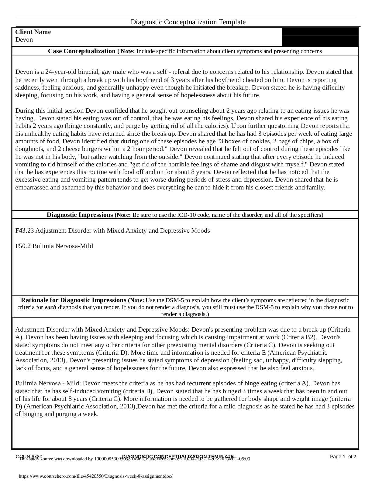 Counseling > QUESTIONS & ANSWERS > COUN 6723 Multicultural Counseling. Week 8 assignment Diagnostic Conceptualization Template | Walden University (All)