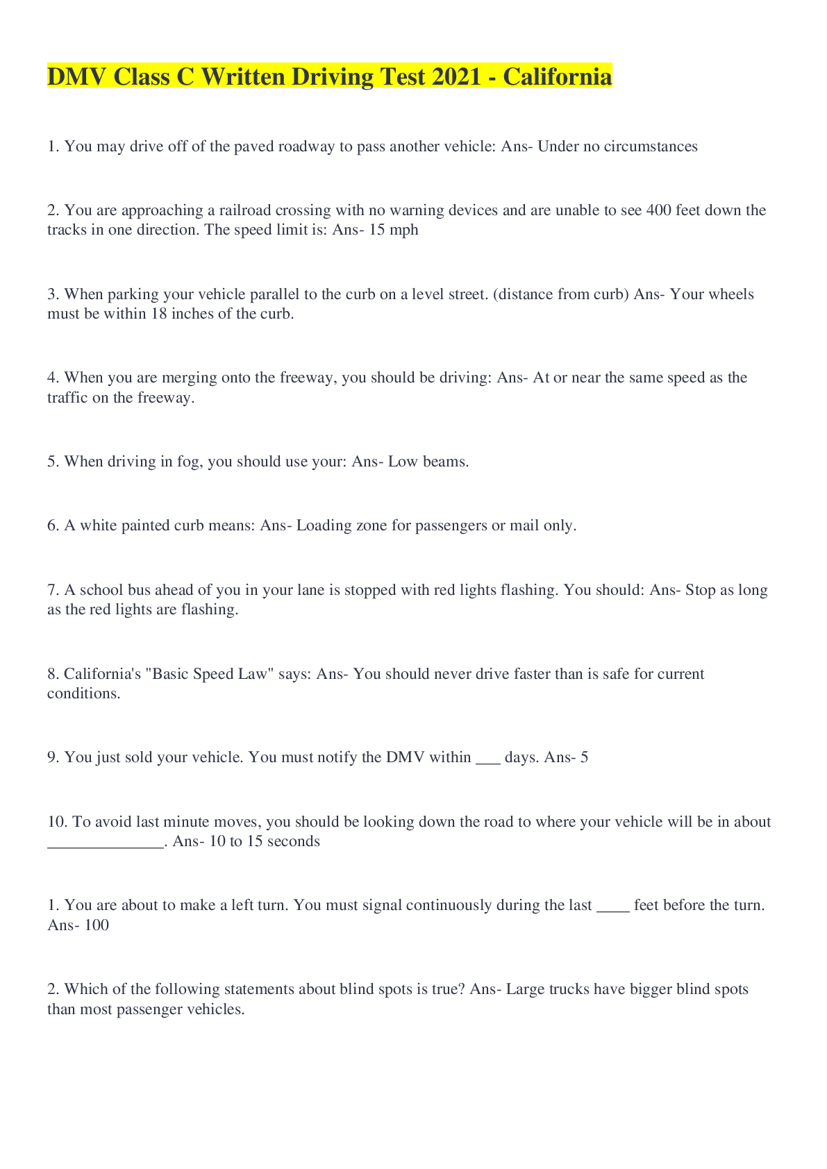 Counseling > EXAMs > DMV Class C Written Driving Test 2021 - California (All)