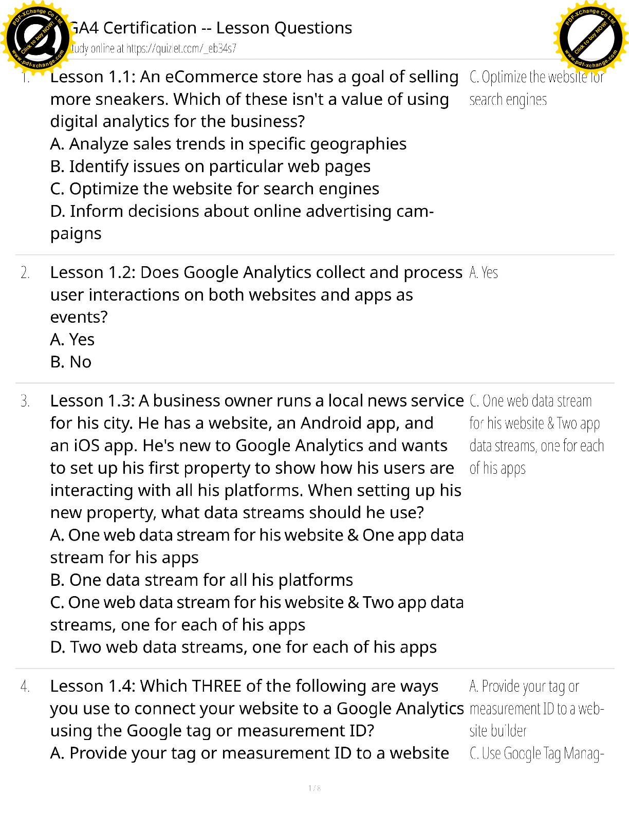 Business Analytics > QUESTIONS & ANSWERS > GA4 Certification / Lesson Questions & Practice Test / 2025 Update / Score 100% (All)