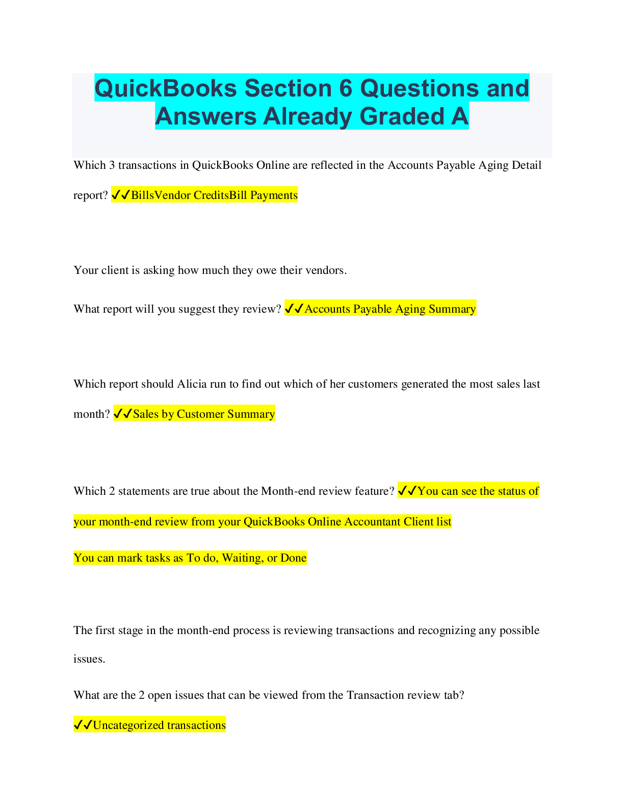 Business > QUESTIONS & ANSWERS > QuickBooks Section 6 Questions and Answers Already Graded A (All)