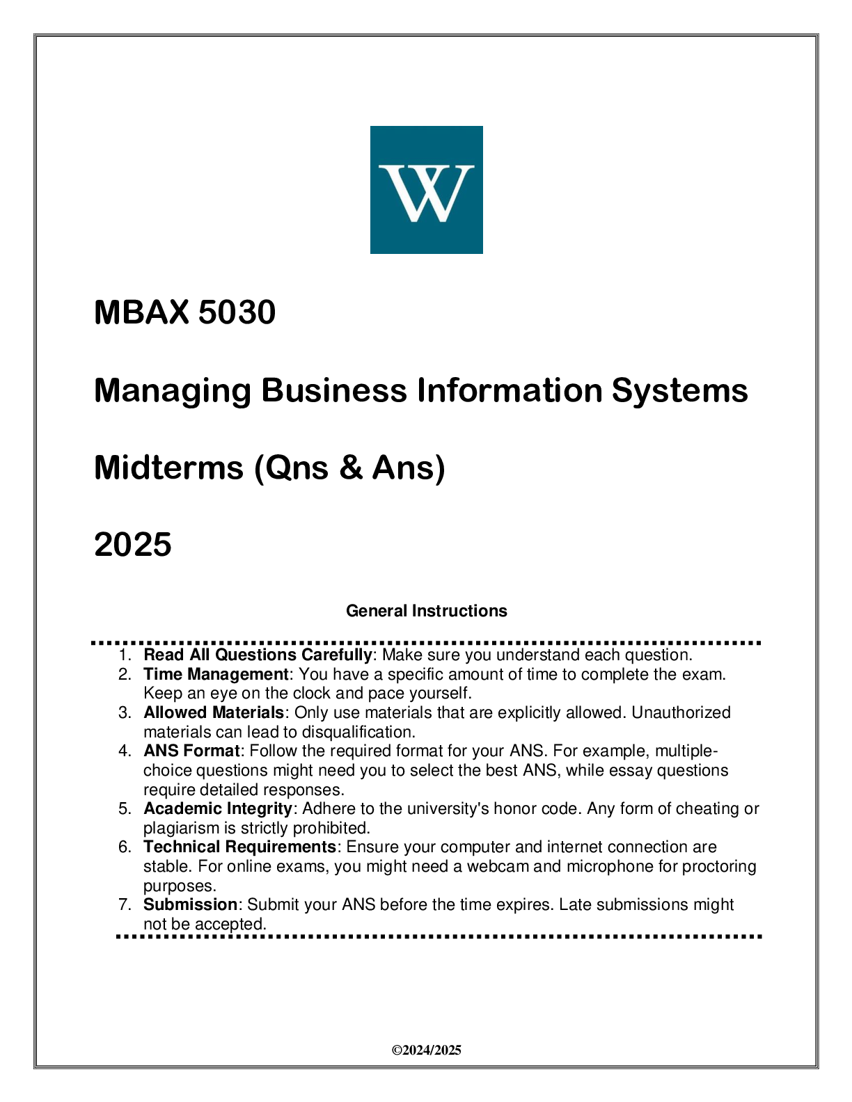 Business > FINAL EXAM > MBAX 5030 Managing Business Information Systems Midterms (Qns & Ans) 2025 WU (All)