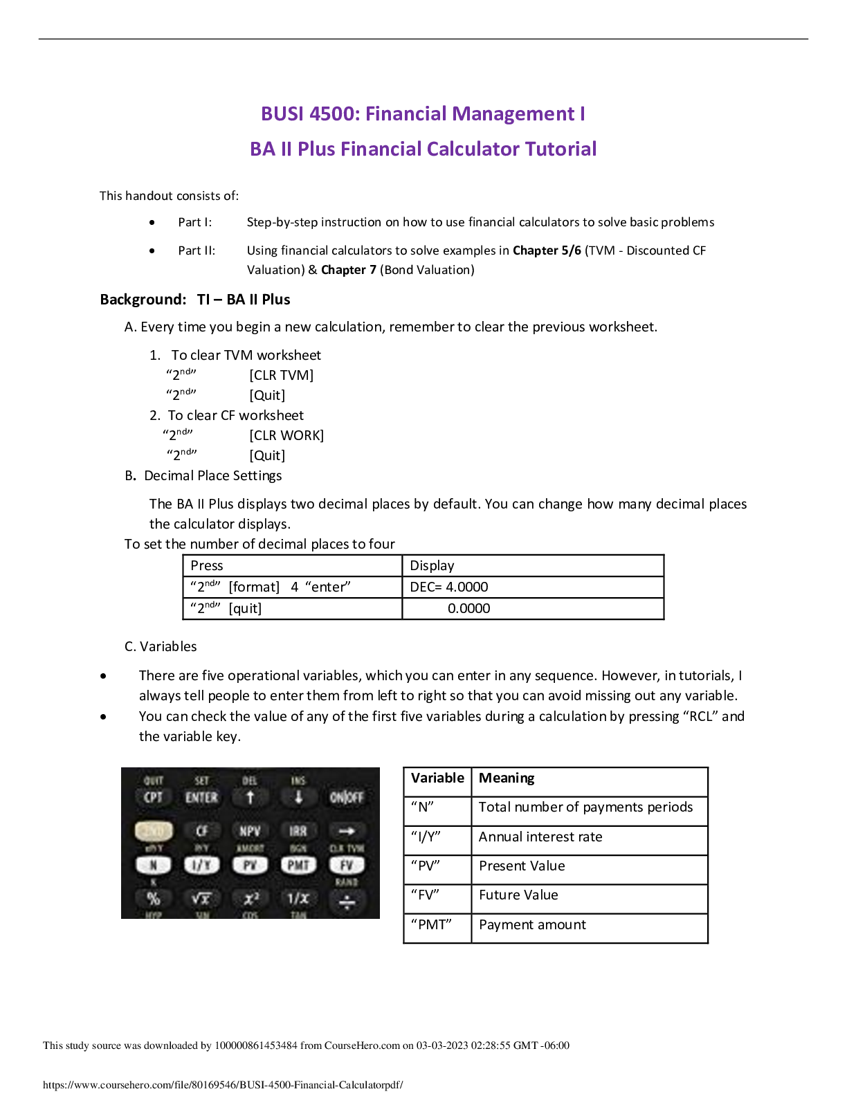 Business > STUDY GUIDE > BUSI 4500 Financial Calculator.pdf - BUSI 4500: Financial Management IBA II Plus Financial Calculator Tutorial (100% GUARANTEED) (All)