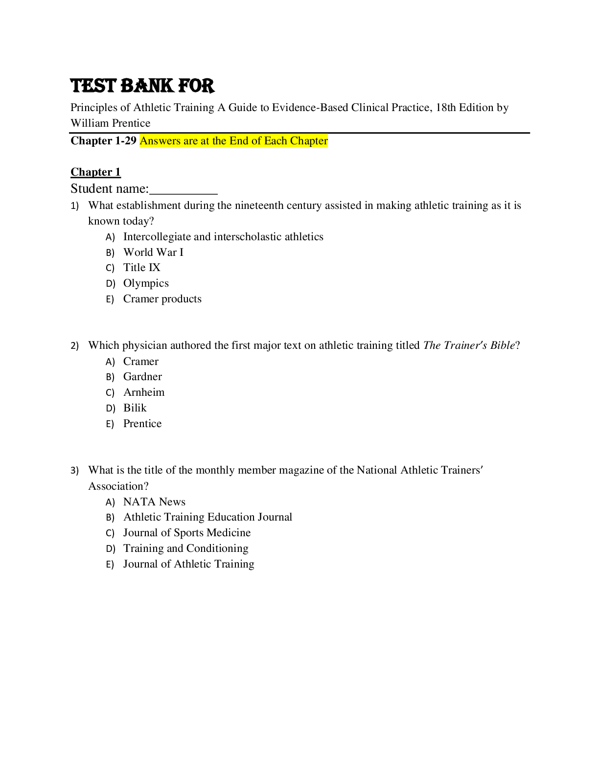 Business > TEST BANKS > Test Bank For Principles of Athletic Training A Guide to Evidence-Based Clinical Practice, 18th Edition by William Prentice Chapter 1-29 (All)