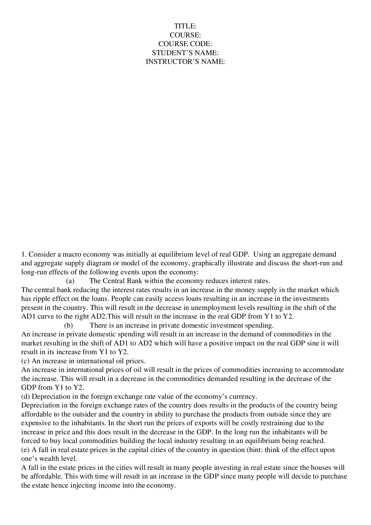 Business > QUESTIONS & ANSWERS > [Solved] 1. Consider a macro economy was initially at equilibrium level of real GDP. Using an (All)