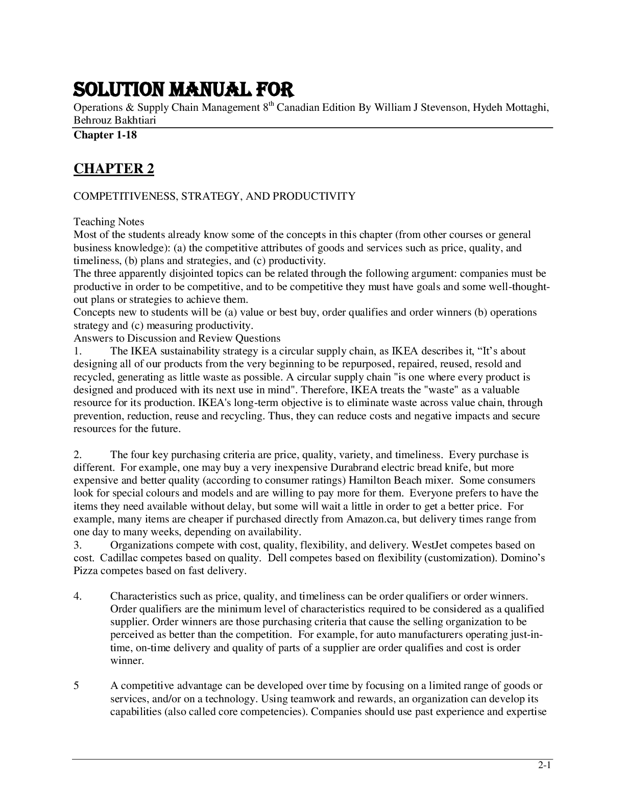 Business > SOLUTIONS MANUAL > Solution Manual For Operations & Supply Chain Management 8th Canadian Edition By William J Stevenson, Hydeh Mottaghi, Behrouz Bakhtiari Chapter 2-18 (All)