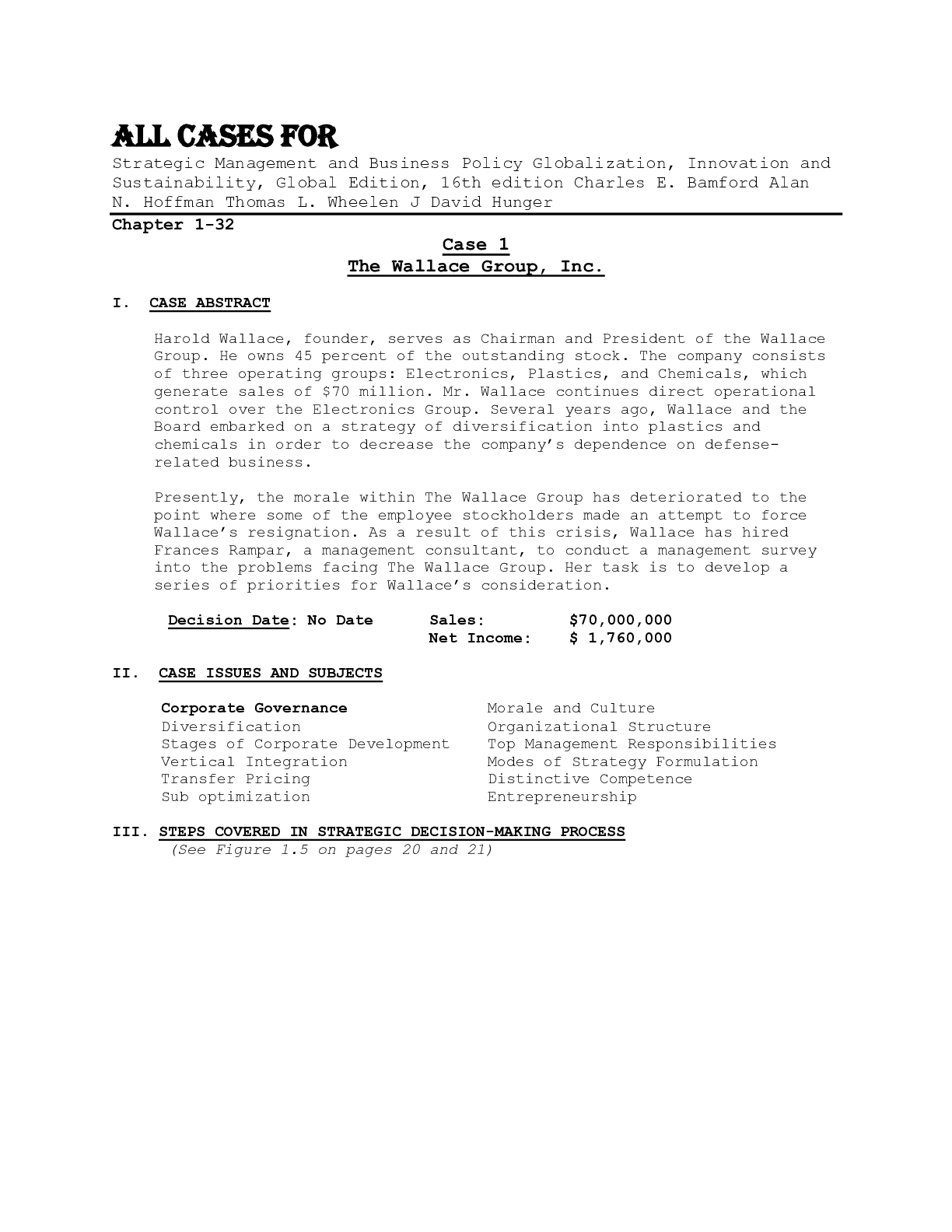 Business > SOLUTIONS MANUAL > CASE SOLUTIONS For Strategic Management and Business Policy Globalization, Innovation and Sustainability, Global Edition, 16th Edition by Charles E. Bamford Alan N. Hoffman Thomas L. Wheelen J David Hunger Chapter 1-32 (All)