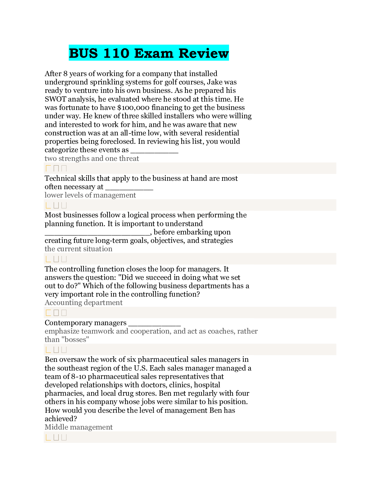 Business > EXAM > BUS 110 Exams Review All Correct Answers (All)