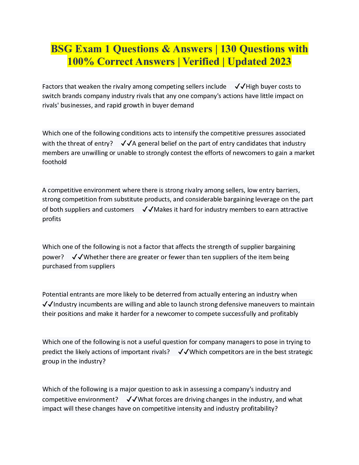 Business > QUESTIONS & ANSWERS > BSG Exam 1 Questions & Answers | 130 Questions with 100% Correct Answers | Verified | Updated 2023 (All)