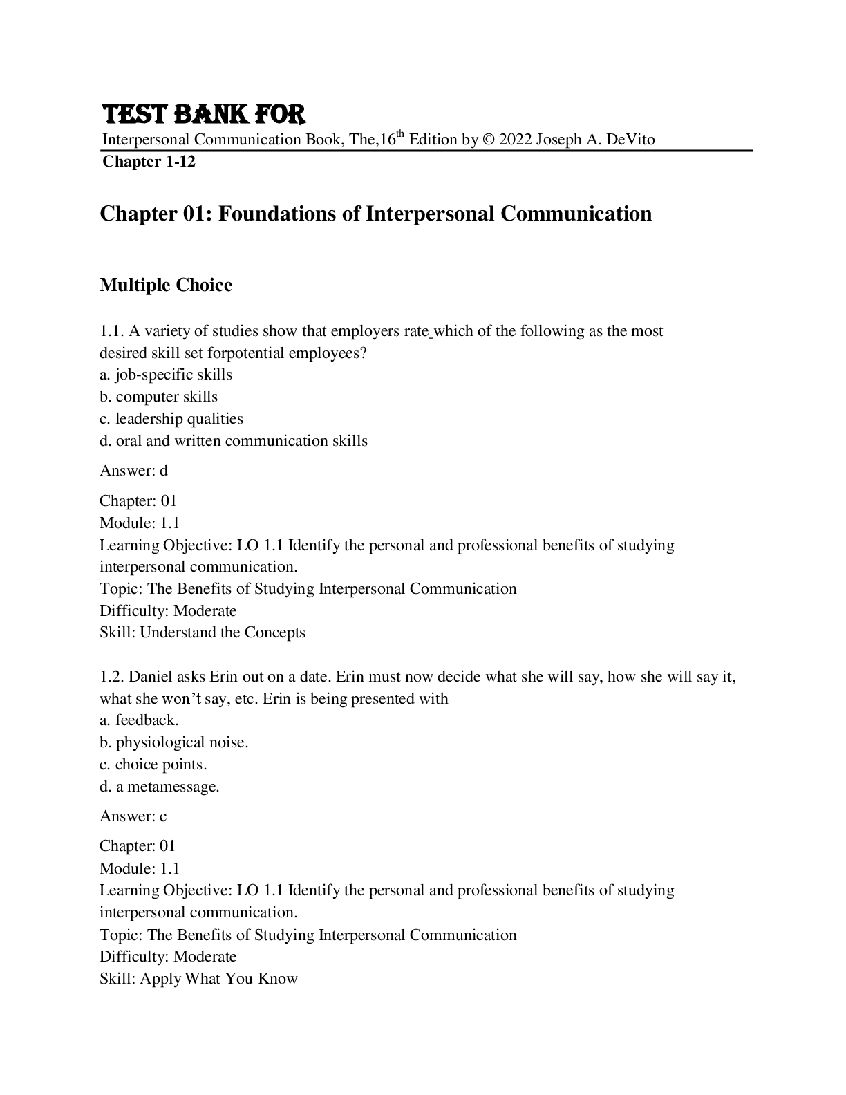 Business > TEST BANKS > Test Bank For Interpersonal Communication Book, The, 16th edition © 2022 Joseph A. DeVito (All)