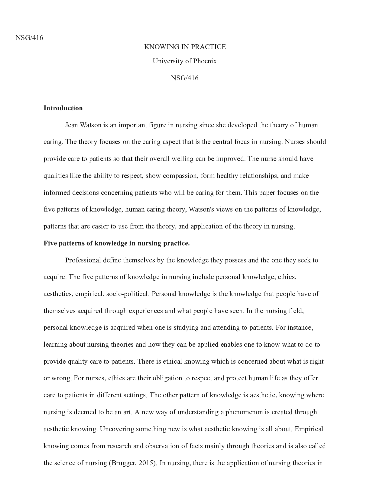 Business > CASE STUDY > Jean Watson theory.docx NSG/416 KNOWING IN PRACTICE University of Phoenix NSG/416 (All)