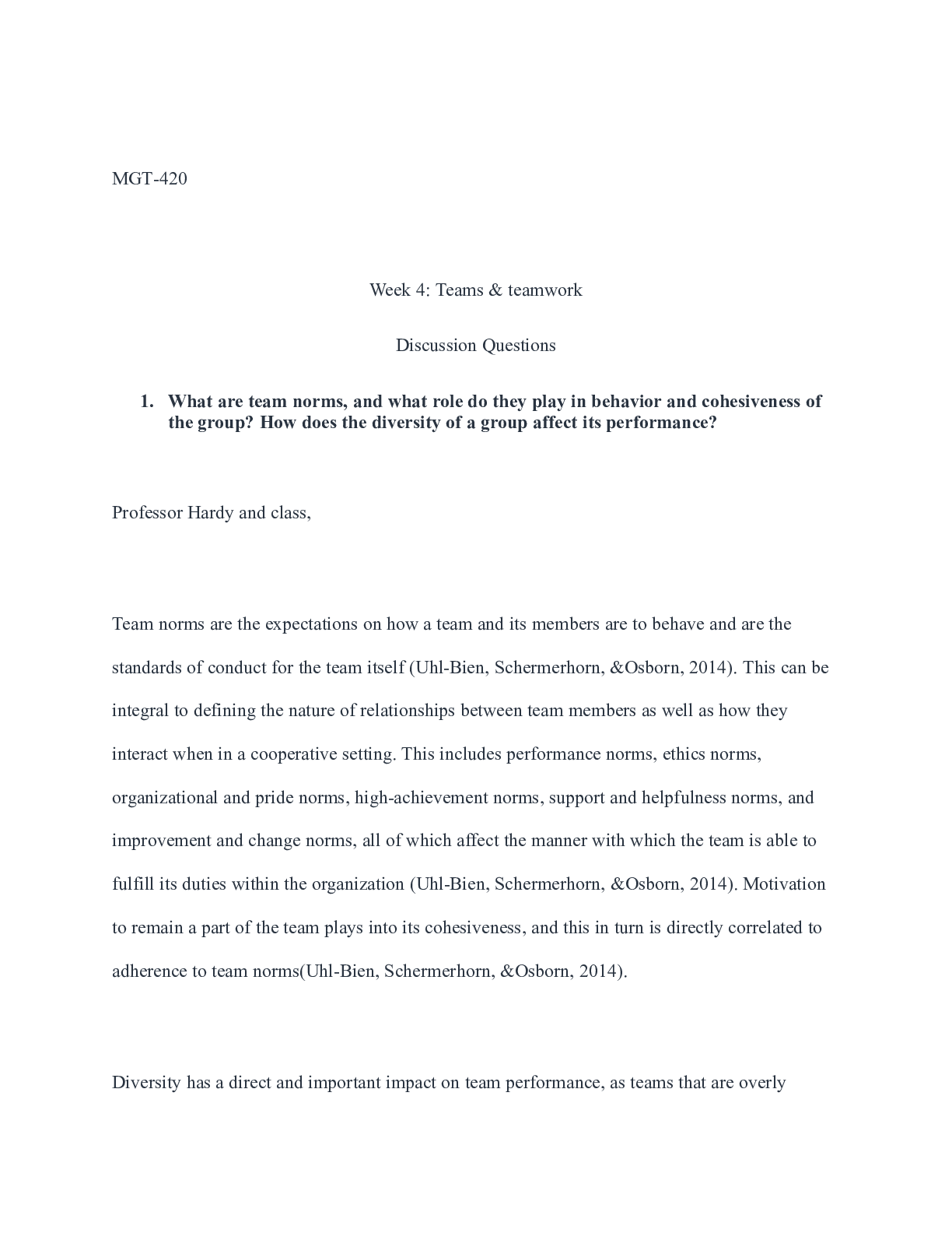 Business > CASE STUDY > Discussion_Questions.docx (1) MGT-420 Week 4: Teams & teamwork Discussion Questions (All)