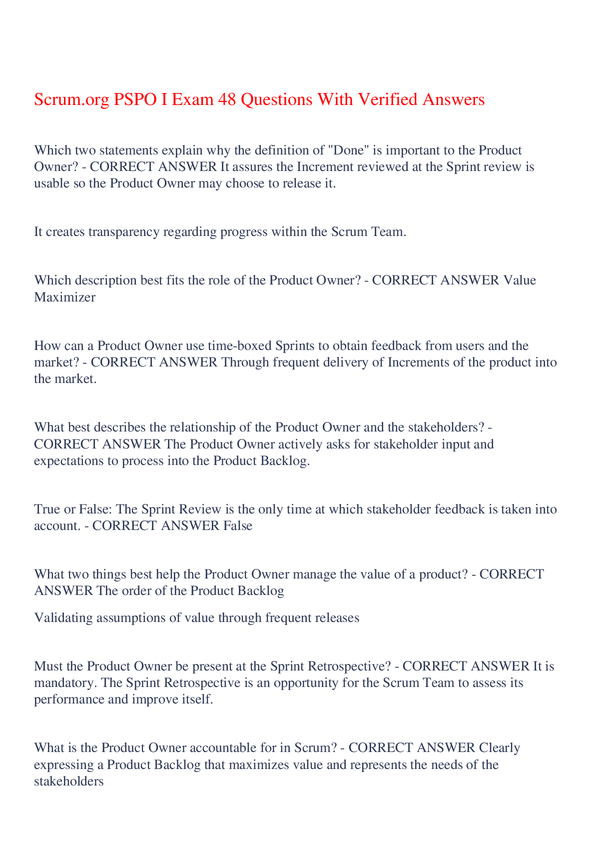 Business > EXAM > Scrum.org PSPO I Exam 48 Questions With Verified Answers,100% CORRECT (All)