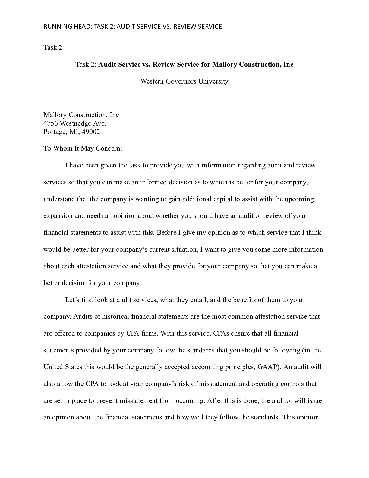 Business > CASE STUDY > Task2.docx (2) Task 2 Task 2: Audit Service vs. Review Service for Mallory Construction, (All)