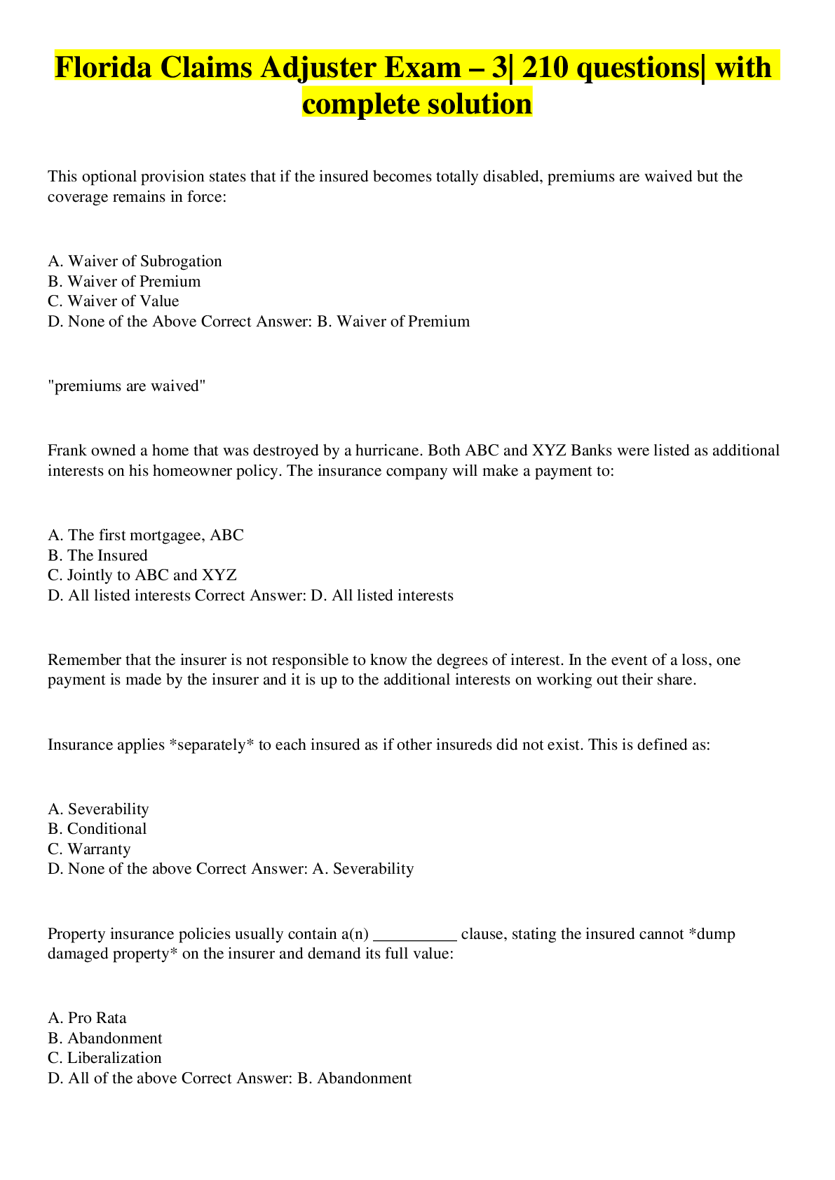 Business > EXAM > Florida Claims Adjuster Exam – 3| 210 questions| with complete solution (All)