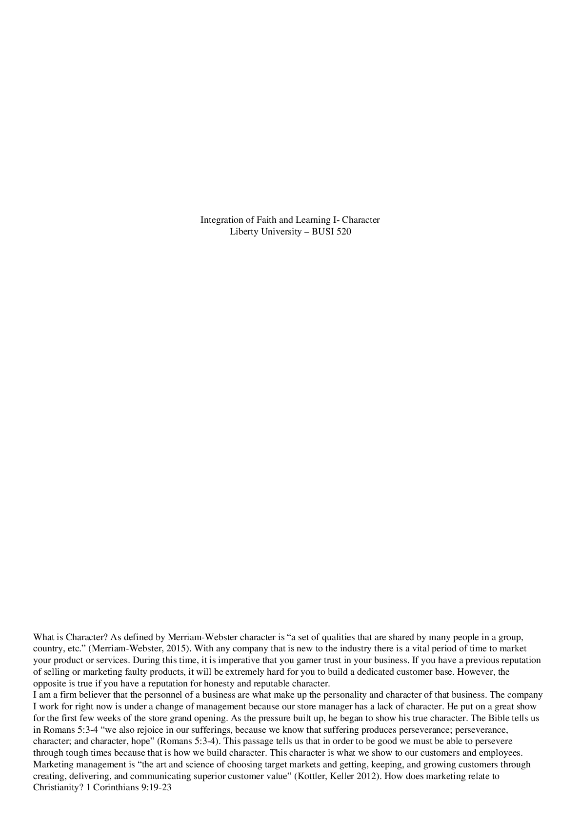 Business > QUESTIONS & ANSWERS > [Solved] Liberty University BUSI 520 Integration of Faith and Learning I- Character (All)