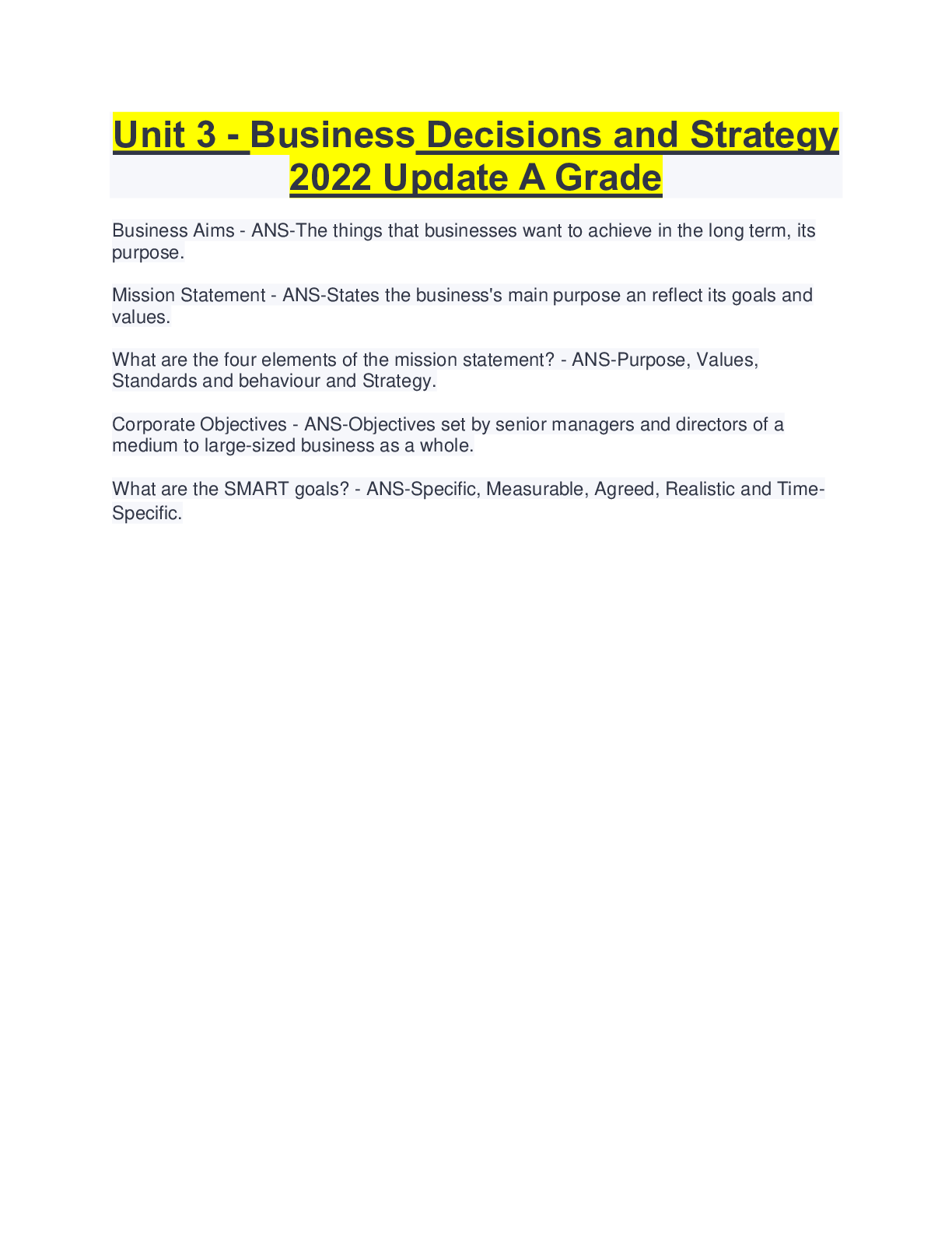 Business > QUESTIONS & ANSWERS > UNIT 3 BUSINESS DECISIONS AND STRATEGY 2022 LATEST UPDATE (All)