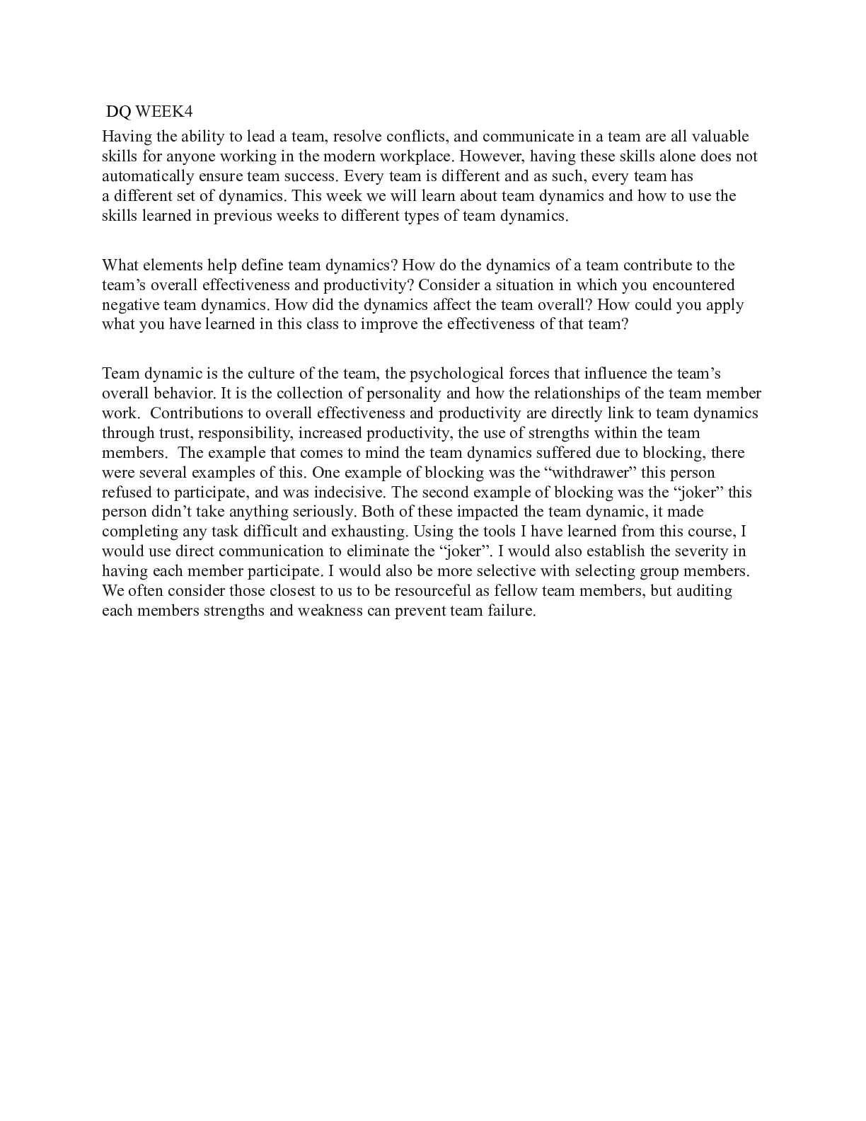 Business > CASE STUDY > DQ WEEK4.docx DQ WEEK4 Having the ability to lead a team, resolve conflicts, and commun (All)