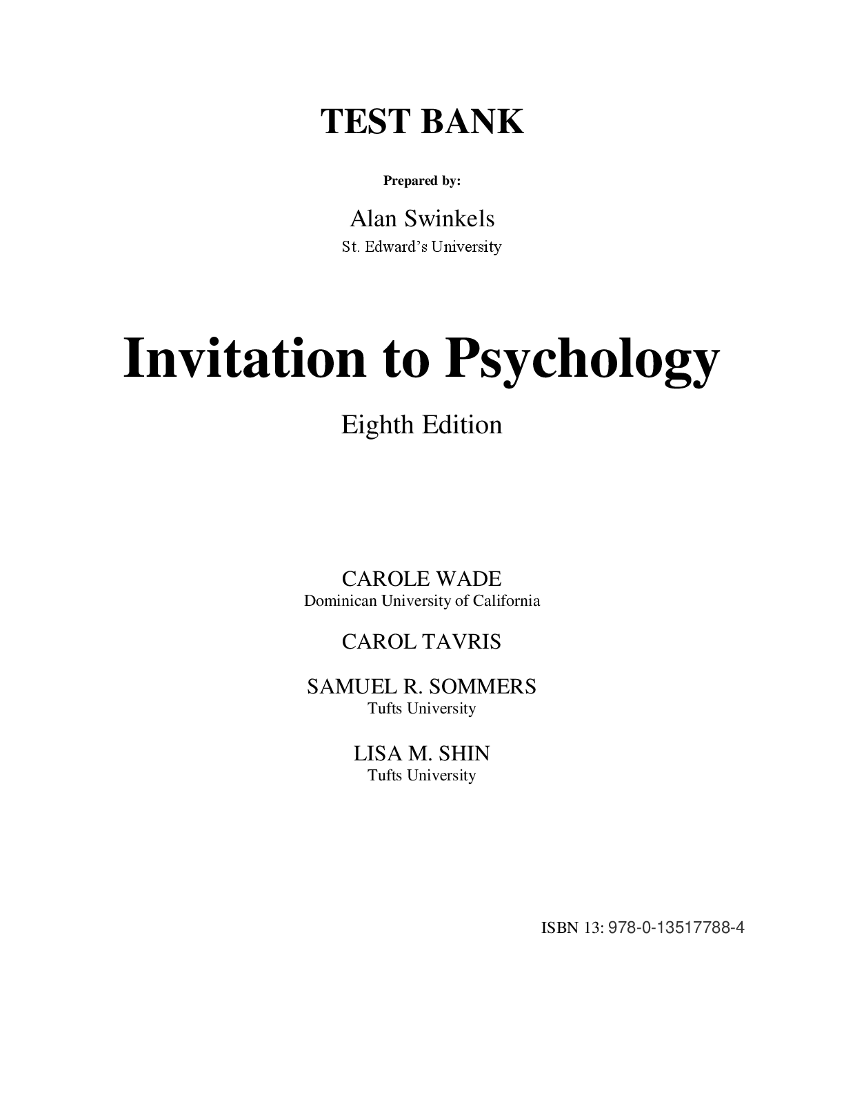 Business > TEST BANKS > Test Bank For Invitation to Psychology, 8th Edition © 2022 Carole Wade Carol Tavris Samuel R Sommers Lisa M. Shin Chapter 1-14 (All)