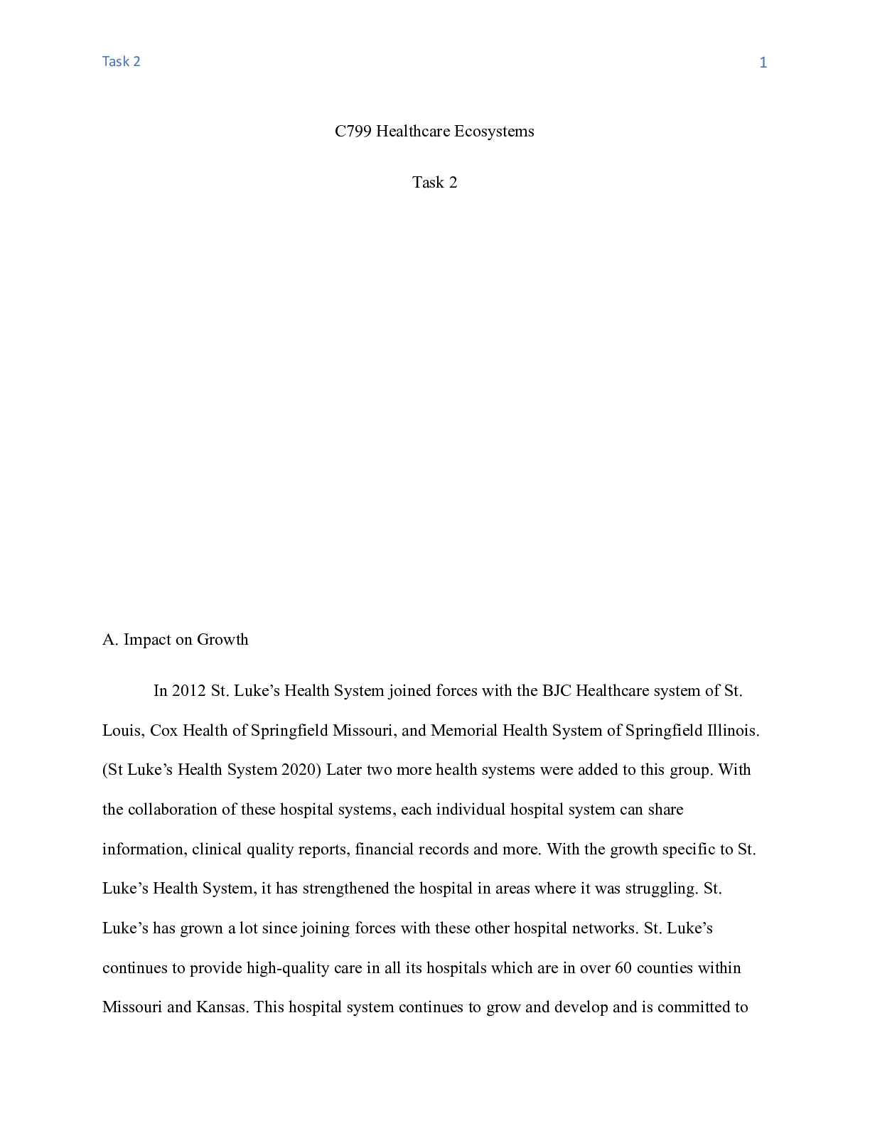 Business > CASE STUDY > C799_Task_2.docx C799 Healthcare Ecosystems Task 2 A. Impact on Growth In 2012 St. Luk (All)