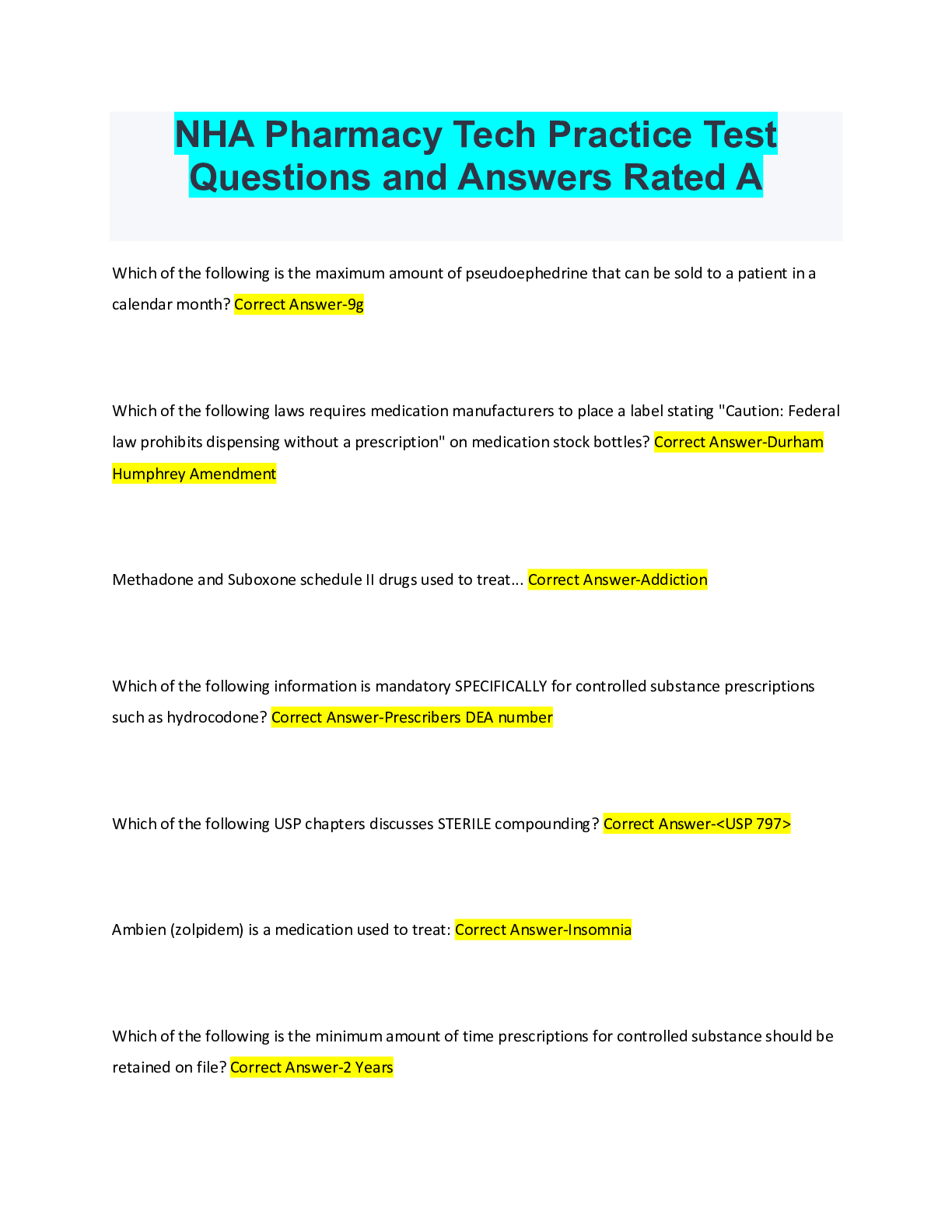 Pharmacology > QUESTIONS & ANSWERS > NHA Pharmacy Tech Practice Test Questions and Answers Rated A (All)