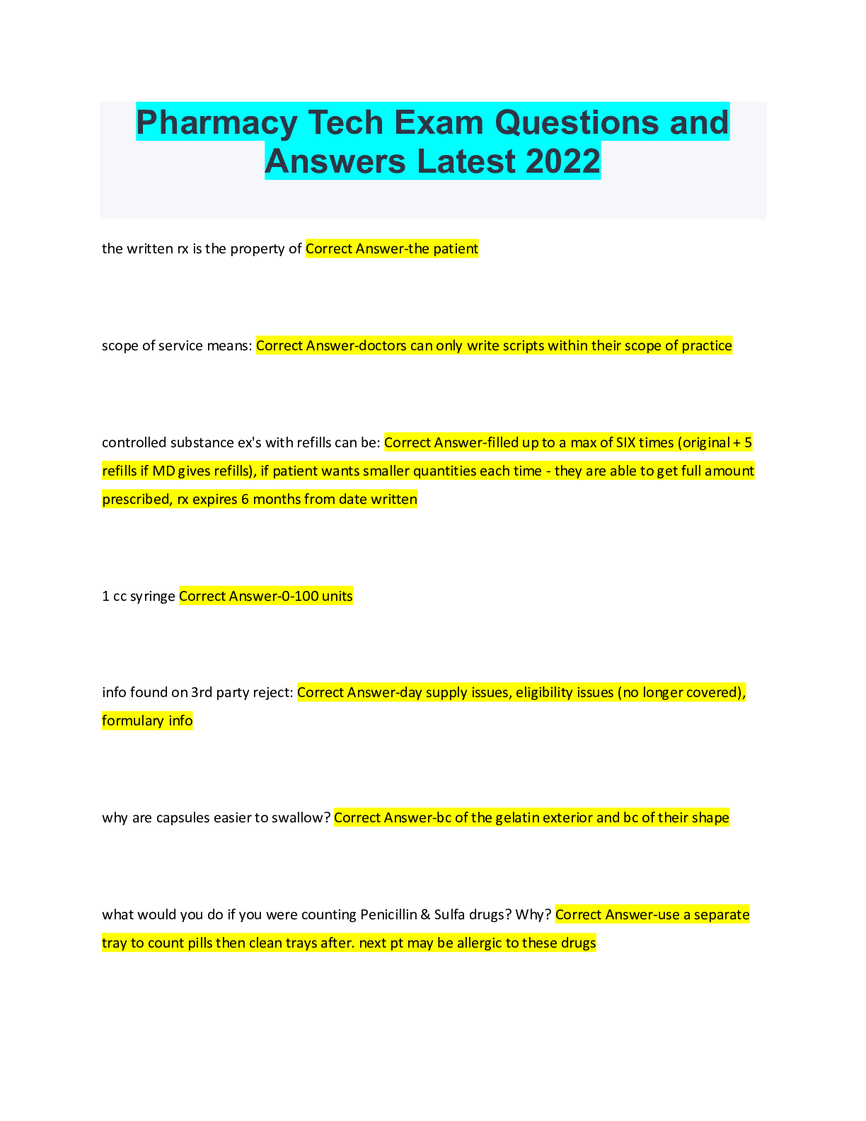 Pharmacology > QUESTIONS & ANSWERS > Pharmacy Tech Exam Questions and Answers Latest 2022 (All)
