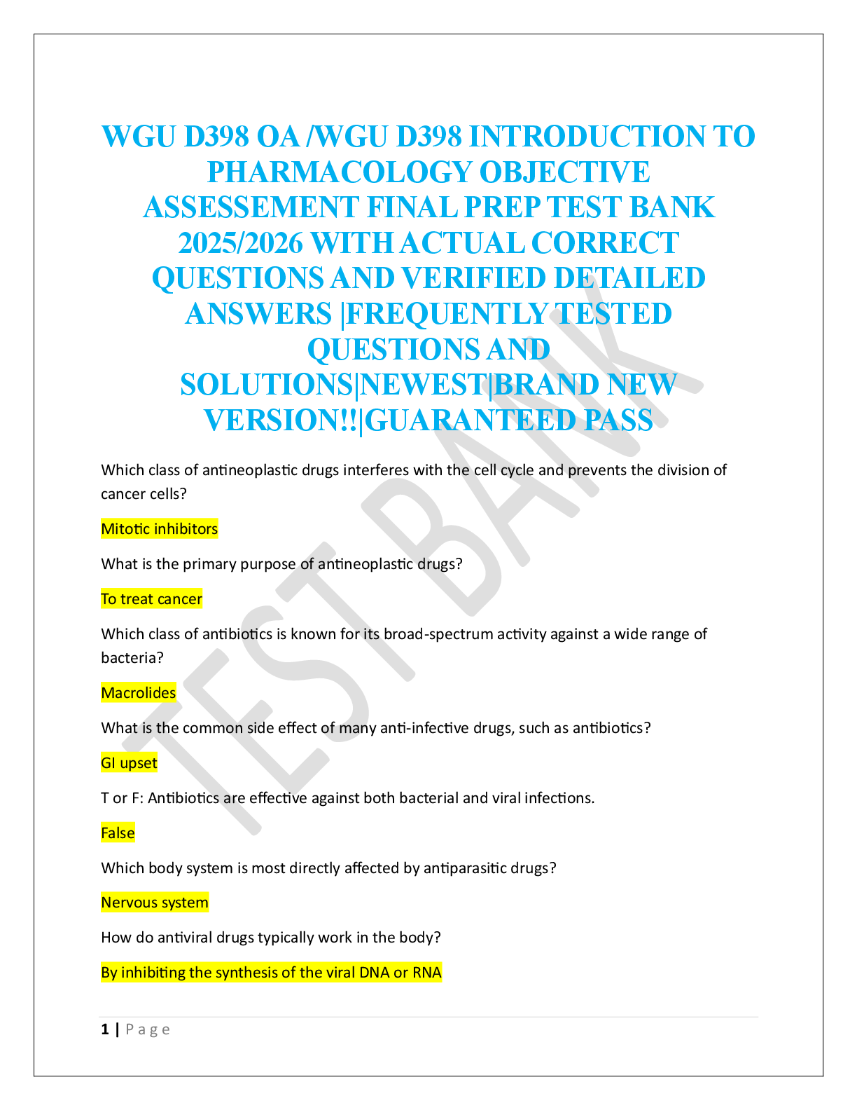 Pharmacology > EXAM > WGU D398 OA /WGU D398 INTRODUCTION TO PHARMACOLOGY (All)