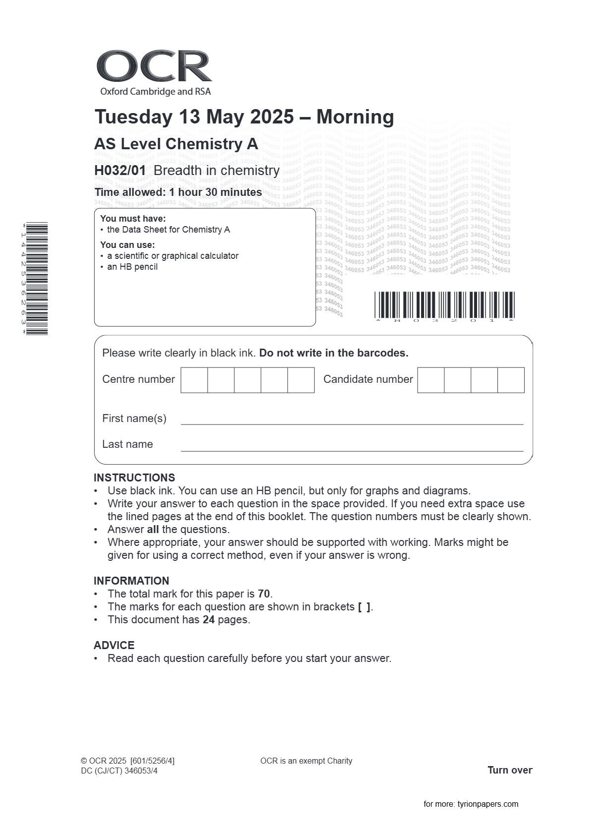 Chemistry > AS Level Question Paper > OCR AS Level Chemistry A H032/01 Breadth in chemistry June 2025 (All)
