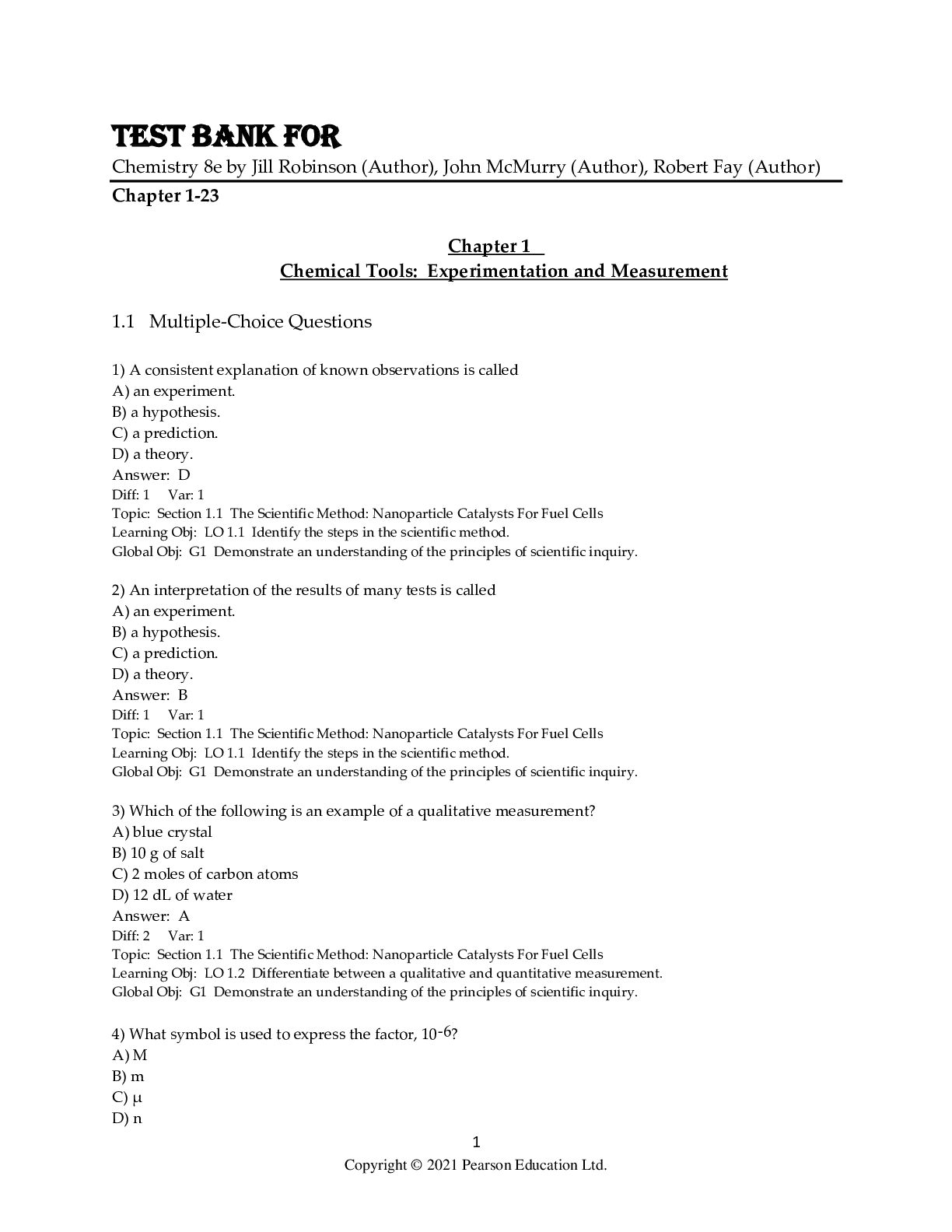 Chemistry > TEST BANKS > Test Bank For Chemistry 8th Edition by Jill Robinson, John McMurry, Robert Fay Chapter 1-23 (All)