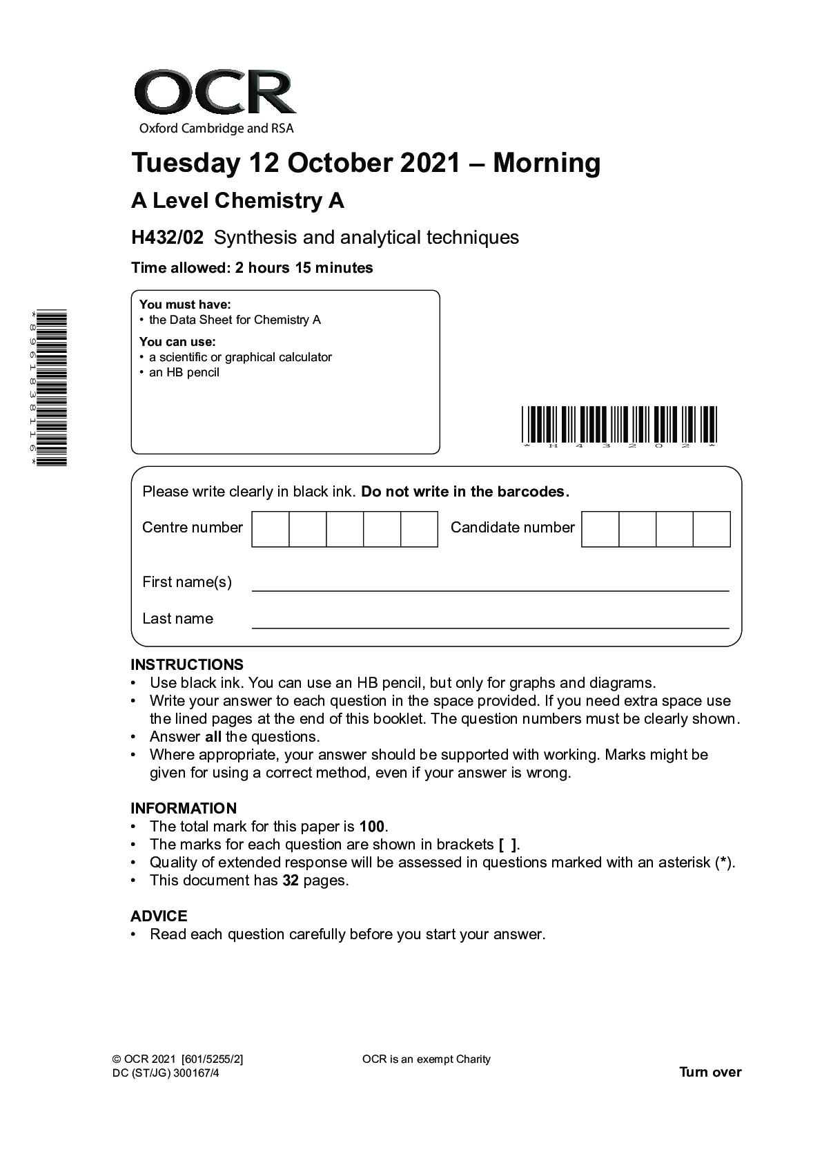 Chemistry > Higher Education > > A Level Chemistry A H432/02 Synthesis and analytical techniques Question Paper October 2021 (All)