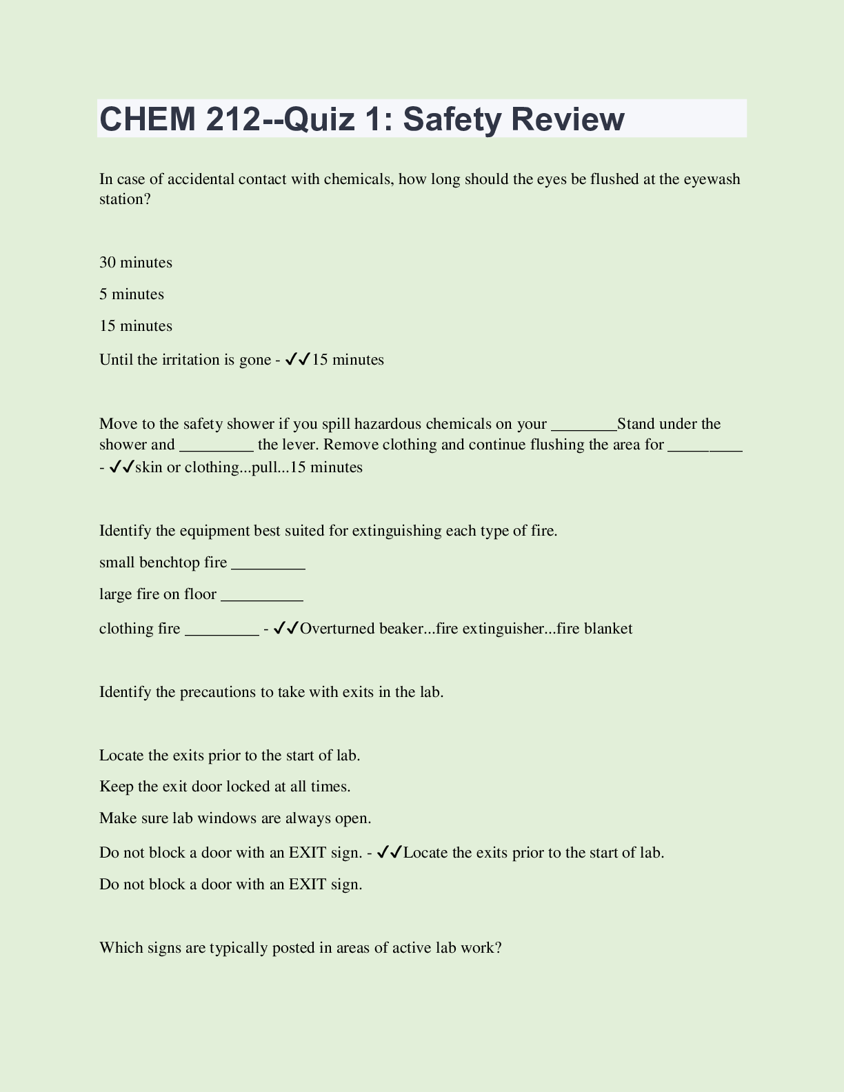Chemistry > Quiz > CHEM 212--Quiz 1: Safety Review | Questions with 100% Correct Answers | Updated & Verified (All)