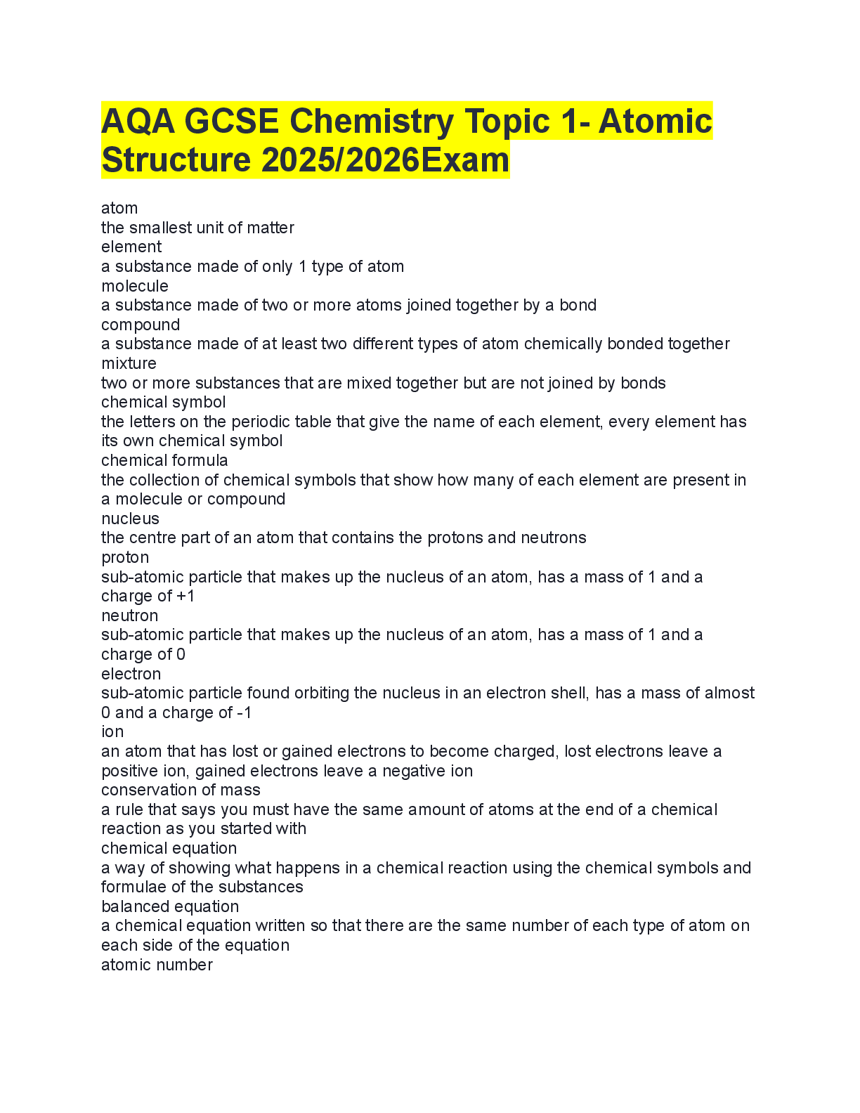 Chemistry > AQA A/As Level Question Paper > AQA GCSE Chemistry Topic 1- Atomic Structure 2025/2026Exam (All)