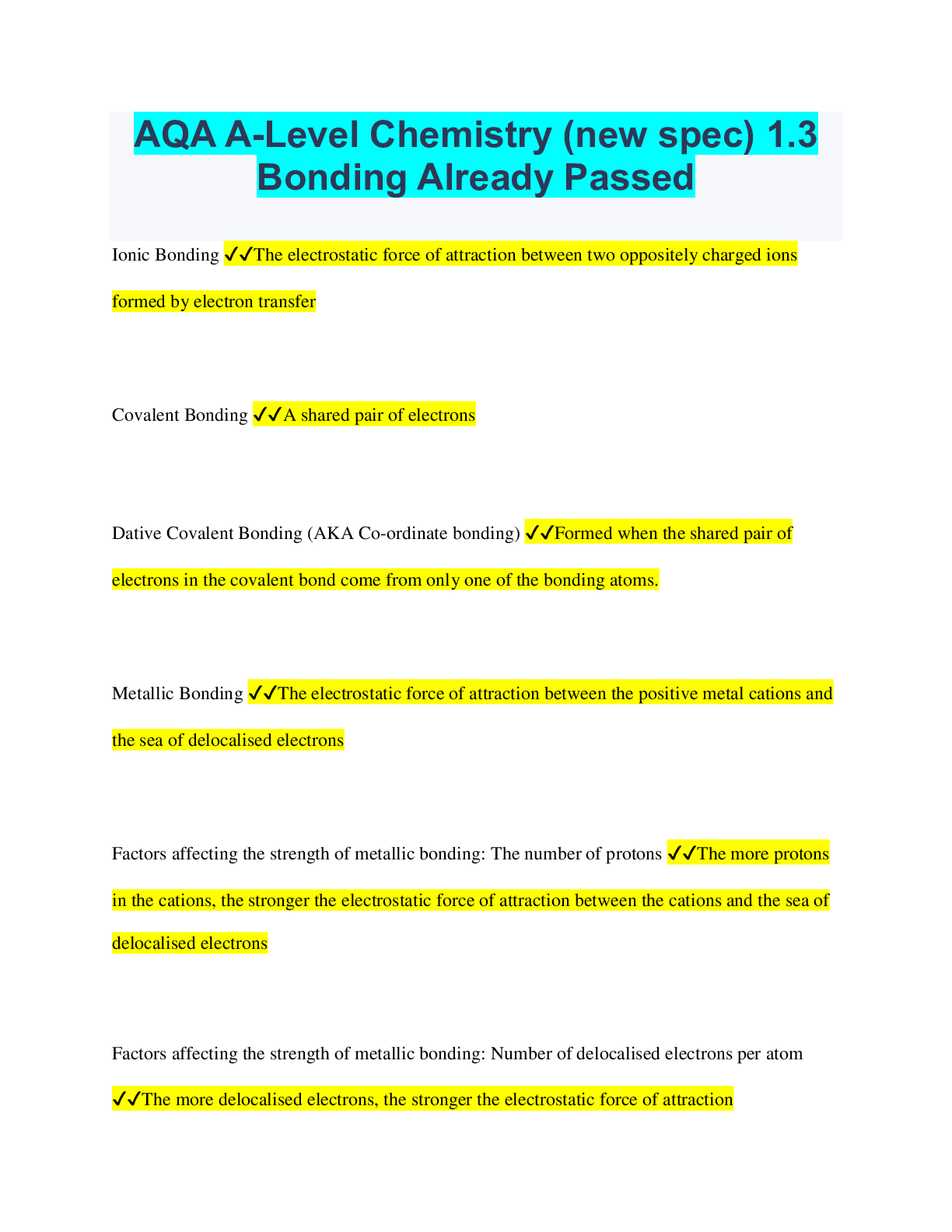 Chemistry > QUESTIONS & ANSWERS > AQA A-Level Chemistry (new spec) 1.3 Bonding Already Passed (All)