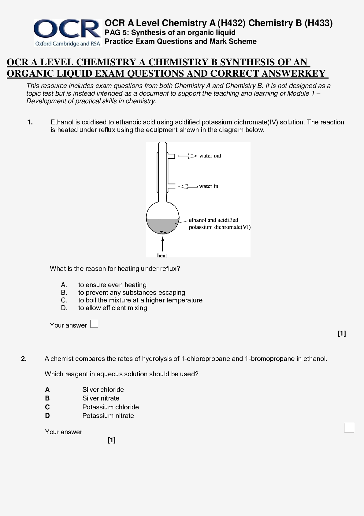 Chemistry > EXAM > OCR A LEVEL CHEMISTRY A CHEMISTRY B SYNTHESIS OF AN ORGANIC LIQUID EXAM QUESTIONS AND CORRECT ANSWERKEY (All)