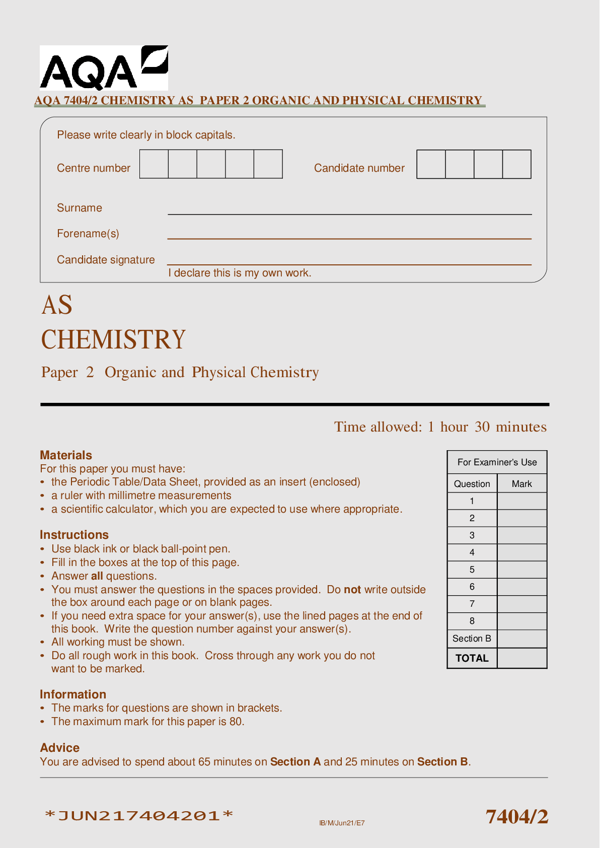 Chemistry > EXAM > AQA 7404/2 CHEMISTRY AS PAPER 2 ORGANIC AND PHYSICAL CHEMISTRY (All)