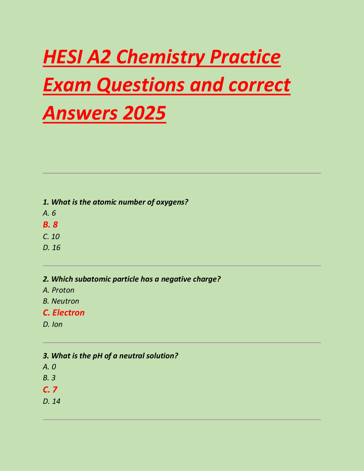 Chemistry > EXAMs > HESI A2 Chemistry Practice Exam Questions and correct Answers 2025 (All)