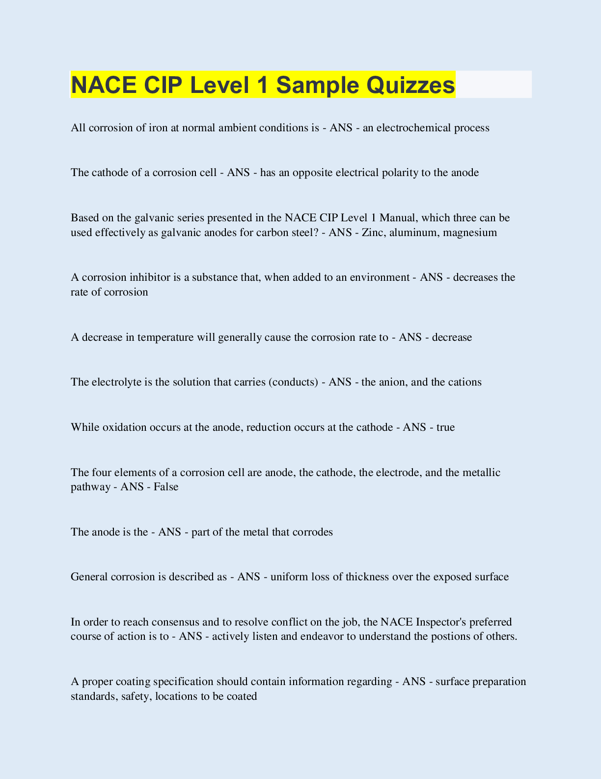 Chemistry > EXAM > NACE CIP Level 1 Sample Quizzes | 100 Questions with 100% Correct Answers | Updated & Verified (All)
