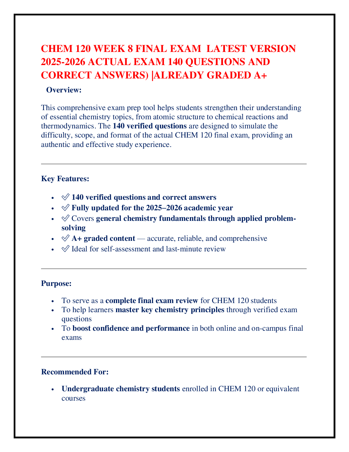 Chemistry > EXAM > CHEM 120 WEEK 8 FINAL EXAM LATEST VERSION 2025-2026 ACTUAL EXAM 140 QUESTIONS AND CORRECT ANSWERS) |ALREADY GRADED A+ (All)