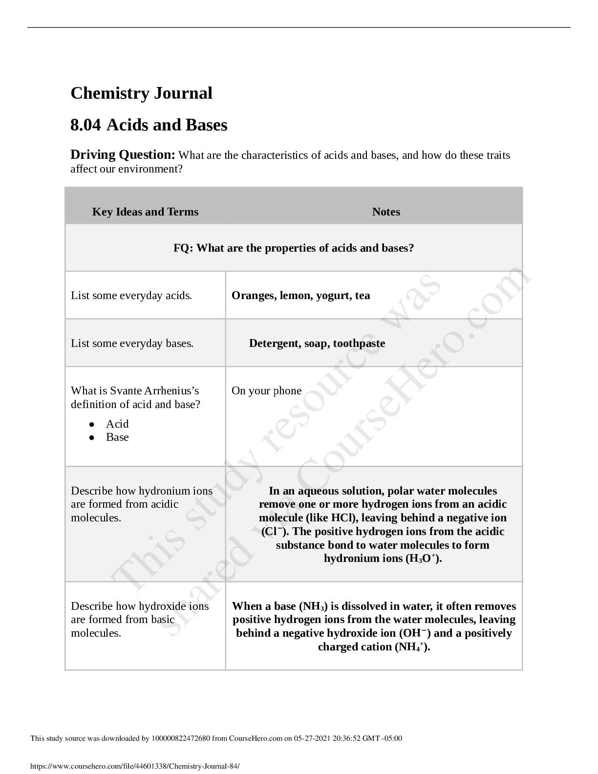 Chemistry > STUDY GUIDE > Riverview High School, Riverview CHEMISTRY MISC Chemistry Journal 8.4-VERIFIED BY EXPERTS (All)