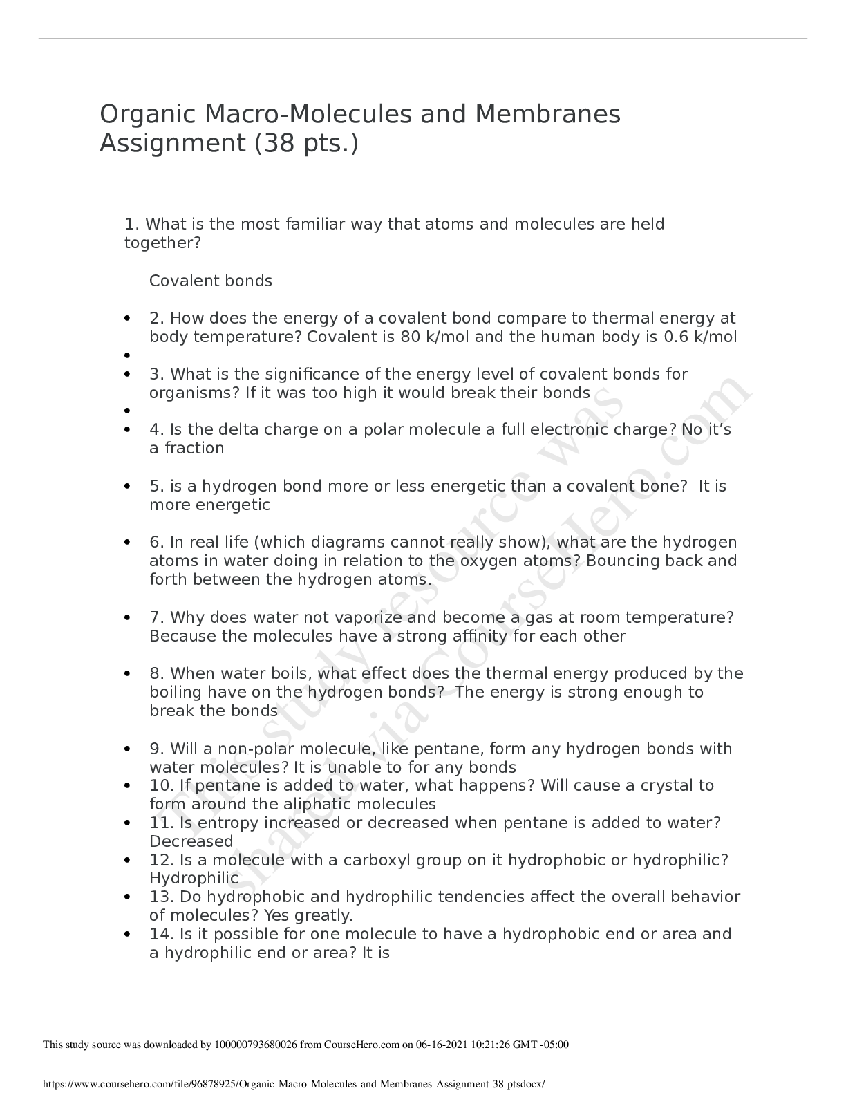 Chemistry > QUESTIONS & ANSWERS > Fanshawe College ACE FA-BIOL 000 Organic Macro-Molecules and Membranes Assignment (38 pts.) (All)