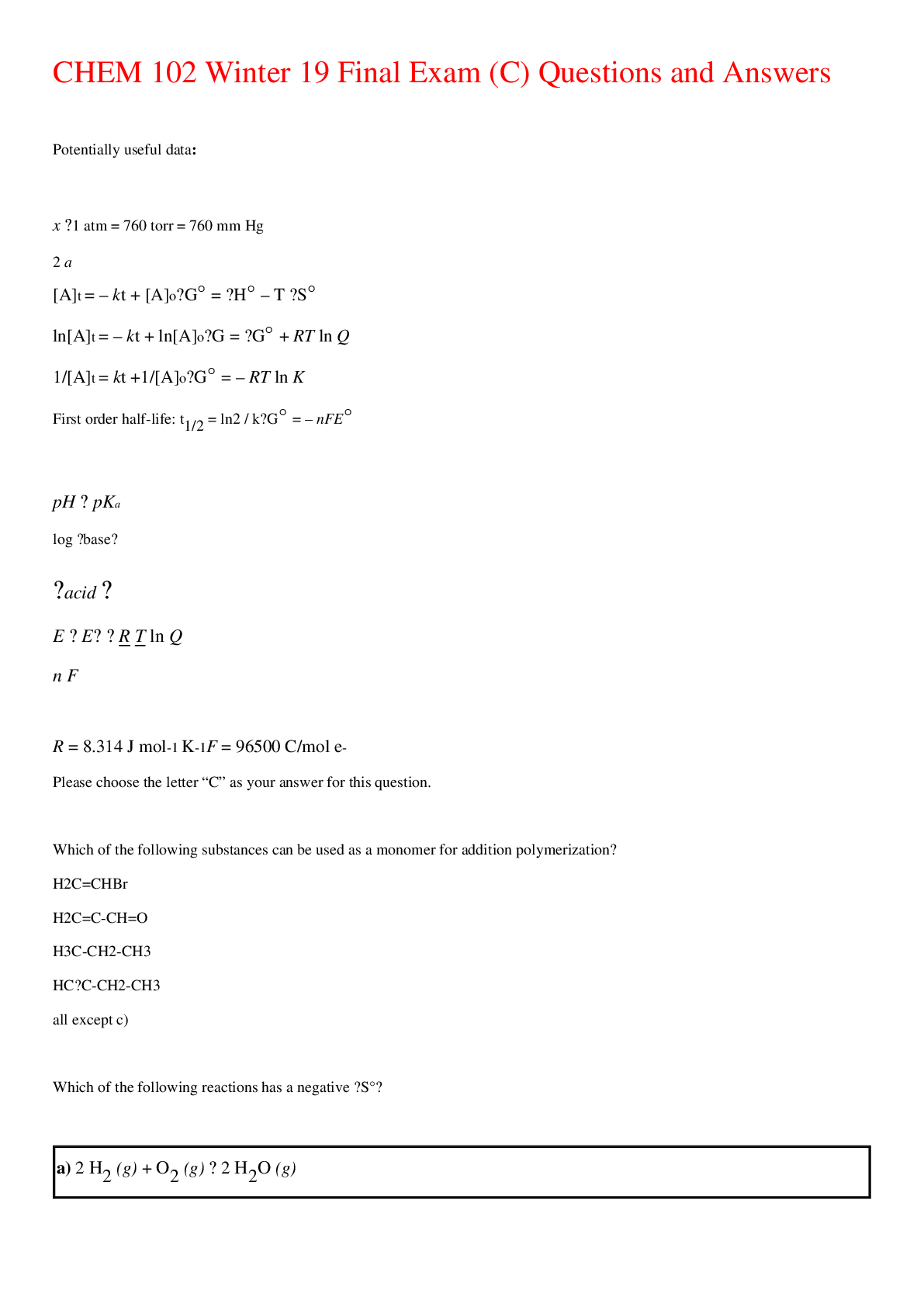 Chemistry > EXAM > CHEM 102 Winter 19 Final Exam (C) Questions and Answers,100% CORRECT (All)