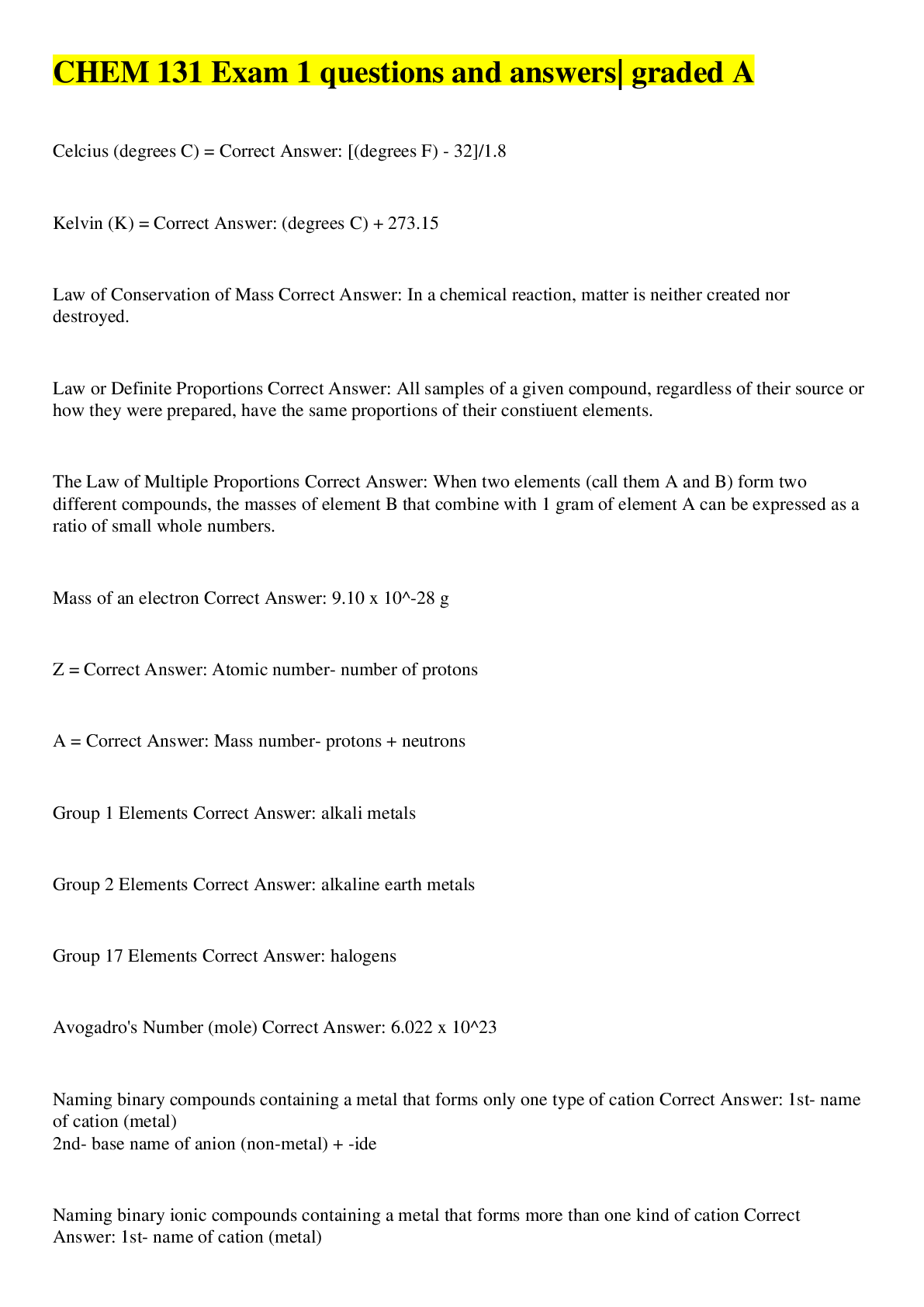 Chemistry > EXAM > CHEM 131 Exam 1 questions and answers| graded A (All)