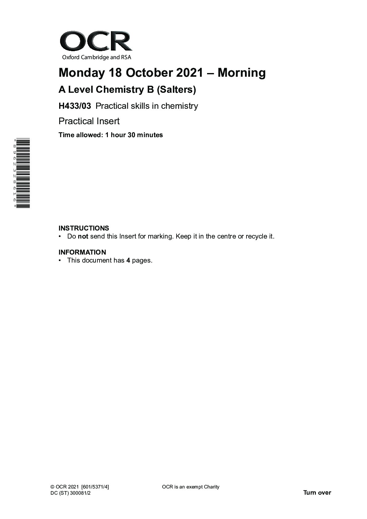 Chemistry > Higher Education > >_ A Level Chemistry B (Salters) H433/03: Practical skills in chemistry Practical Insert || Question Paper Oct 2021 (All)