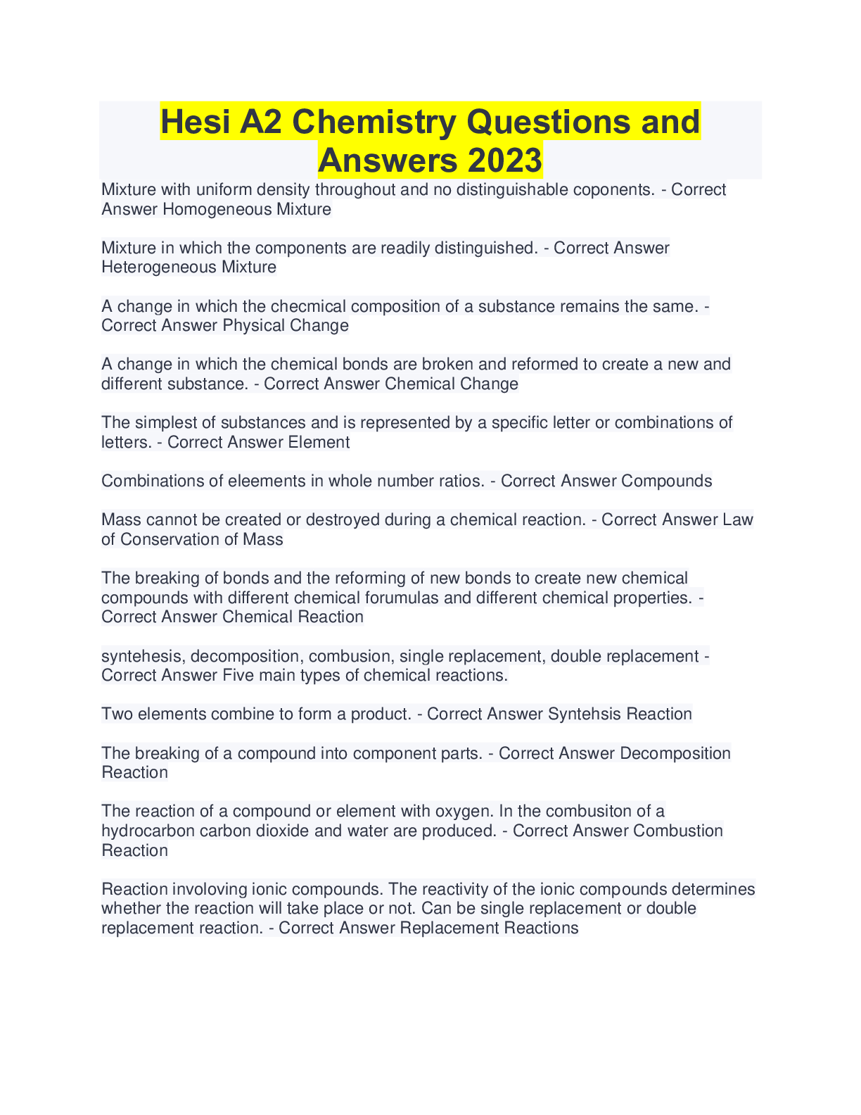 Chemistry > EXAM > Hesi A2 Chemistry Questions and Answers 2023 (All)