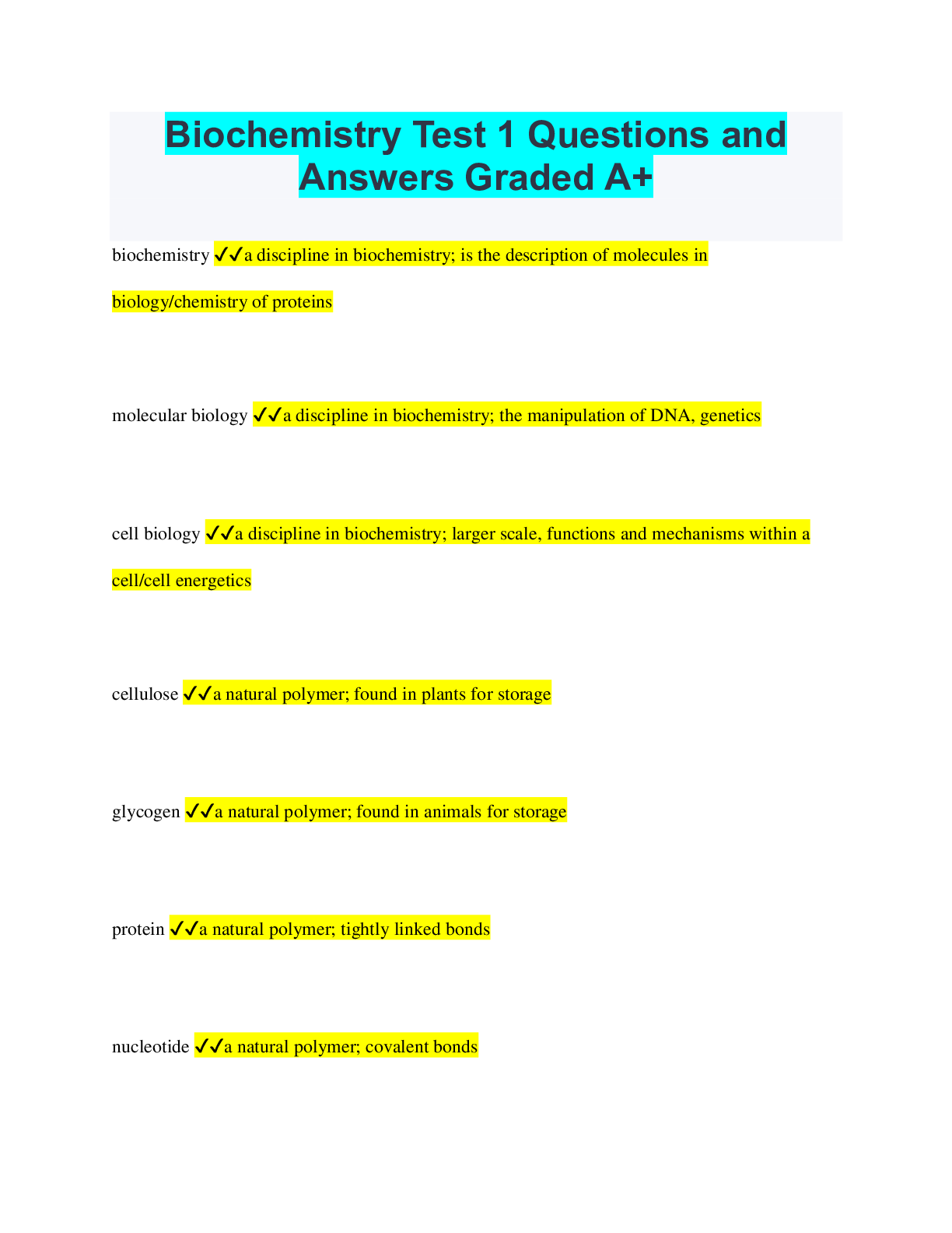 BioChemistry > QUESTIONS & ANSWERS > Biochemistry Test 1 Questions and Answers Graded A+ (All)